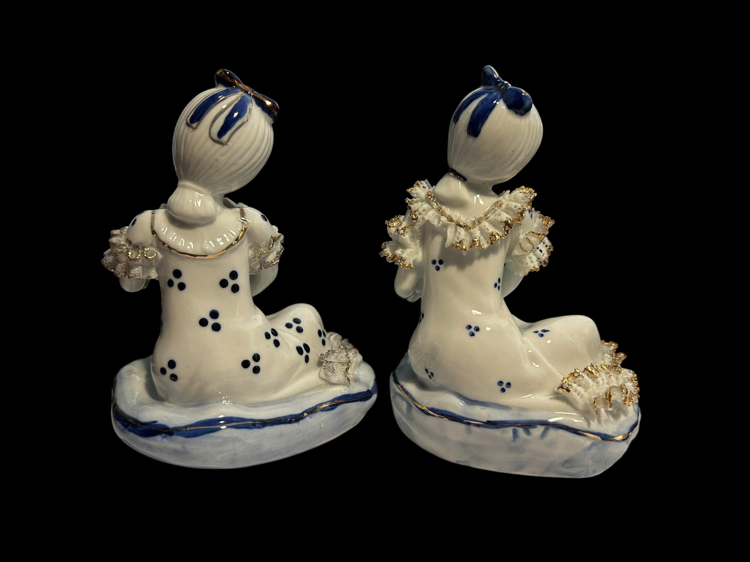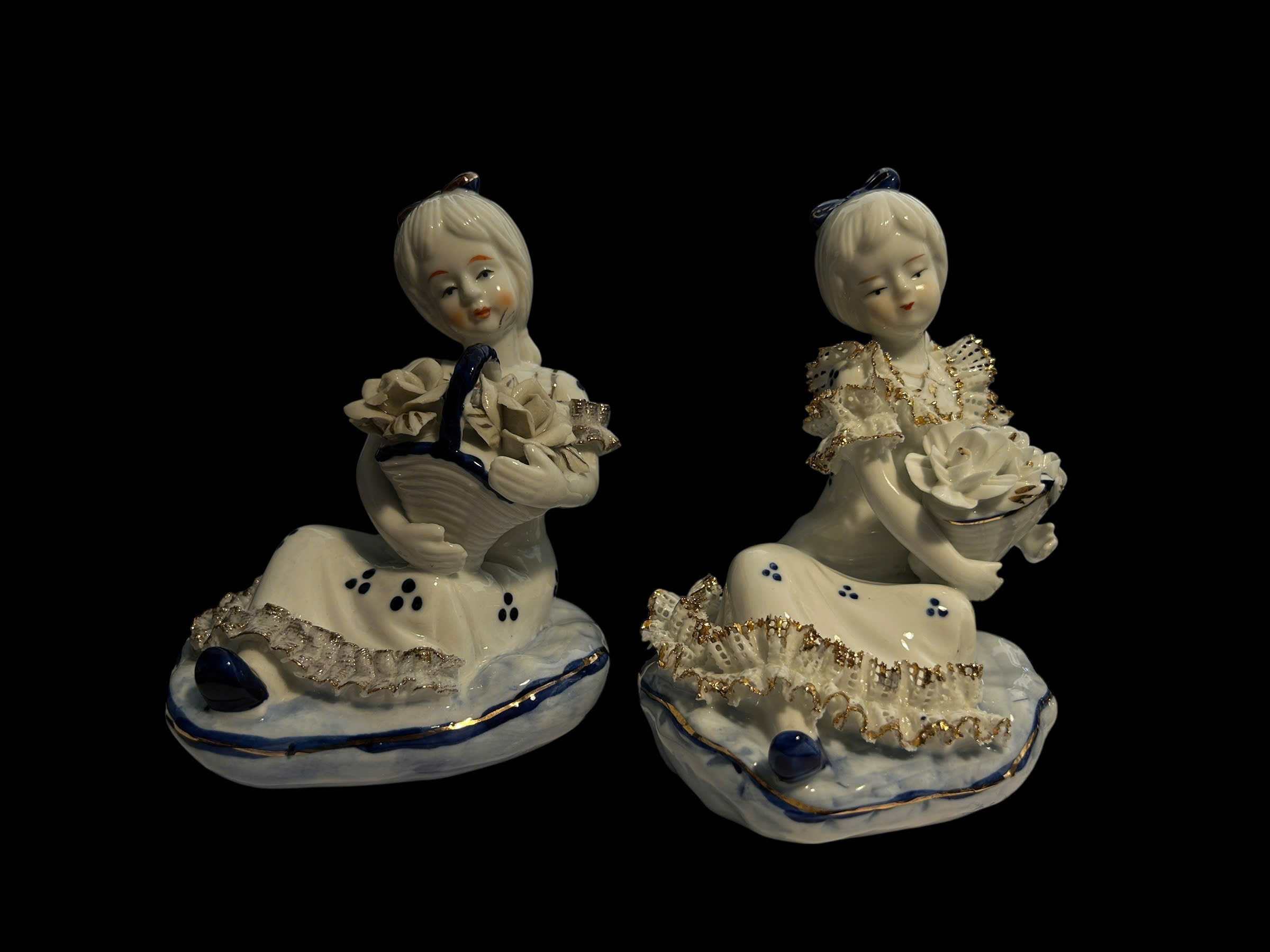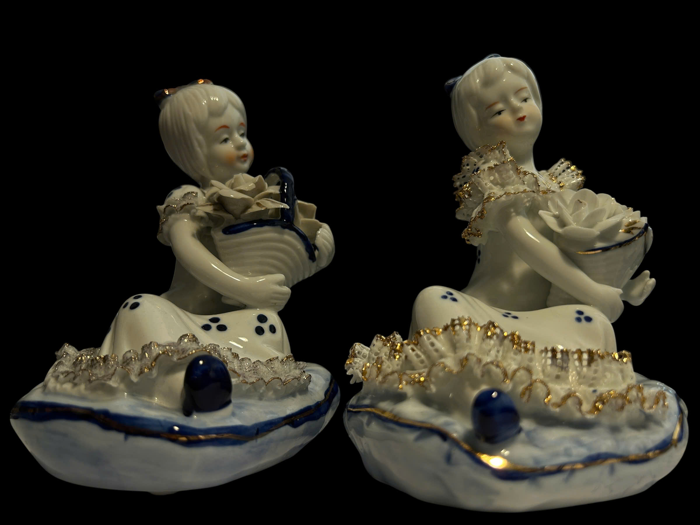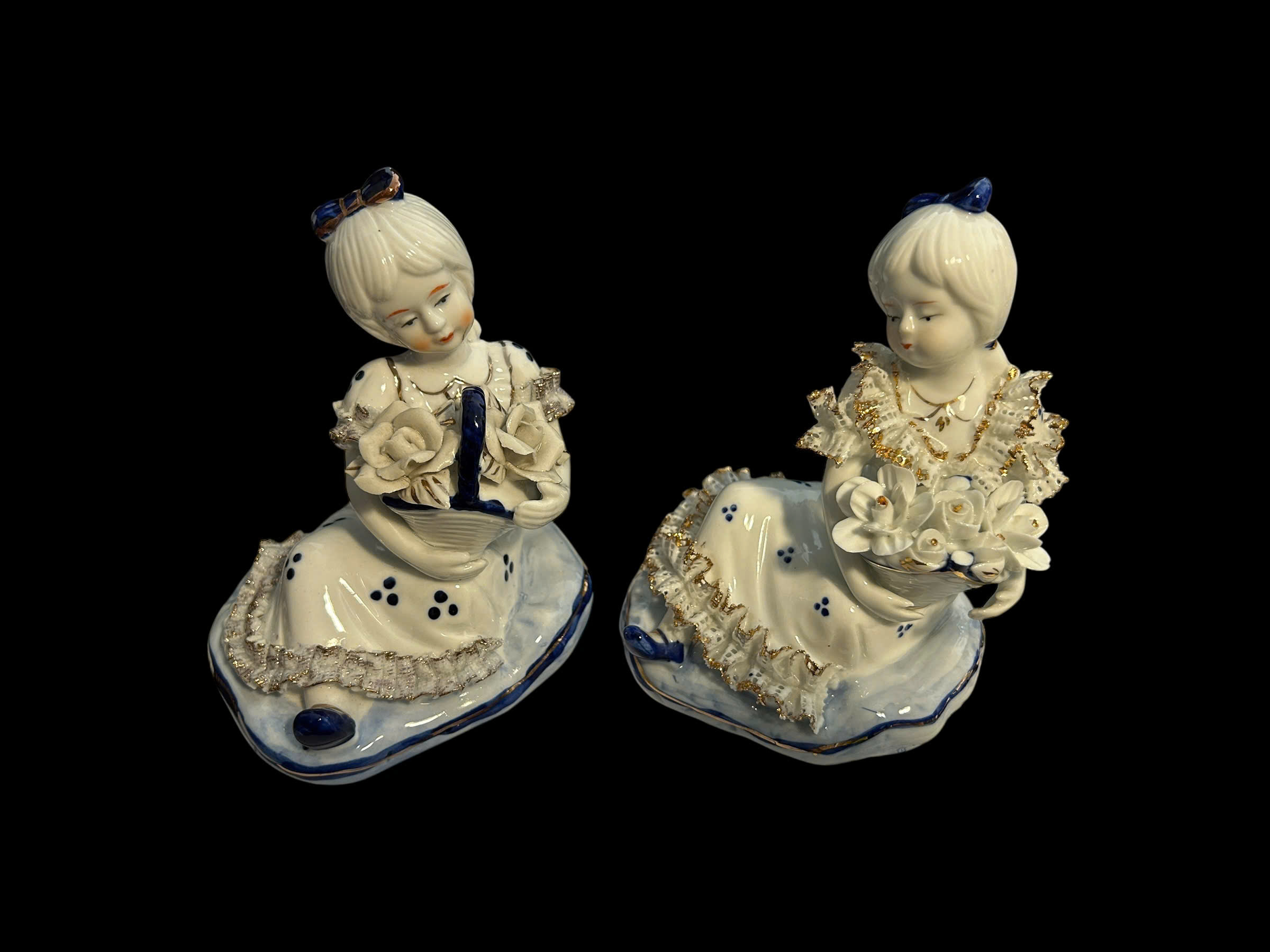 Hai tiểu thư sứ nhỏ nhắn, dịu dàng, ngồi nghiêng trong điệu múa thầm lặng giữa một buổi trà chiều ảo mộng. Mỗi người nâng một giỏ hoa – trong trắng, mềm mại và cao quý.