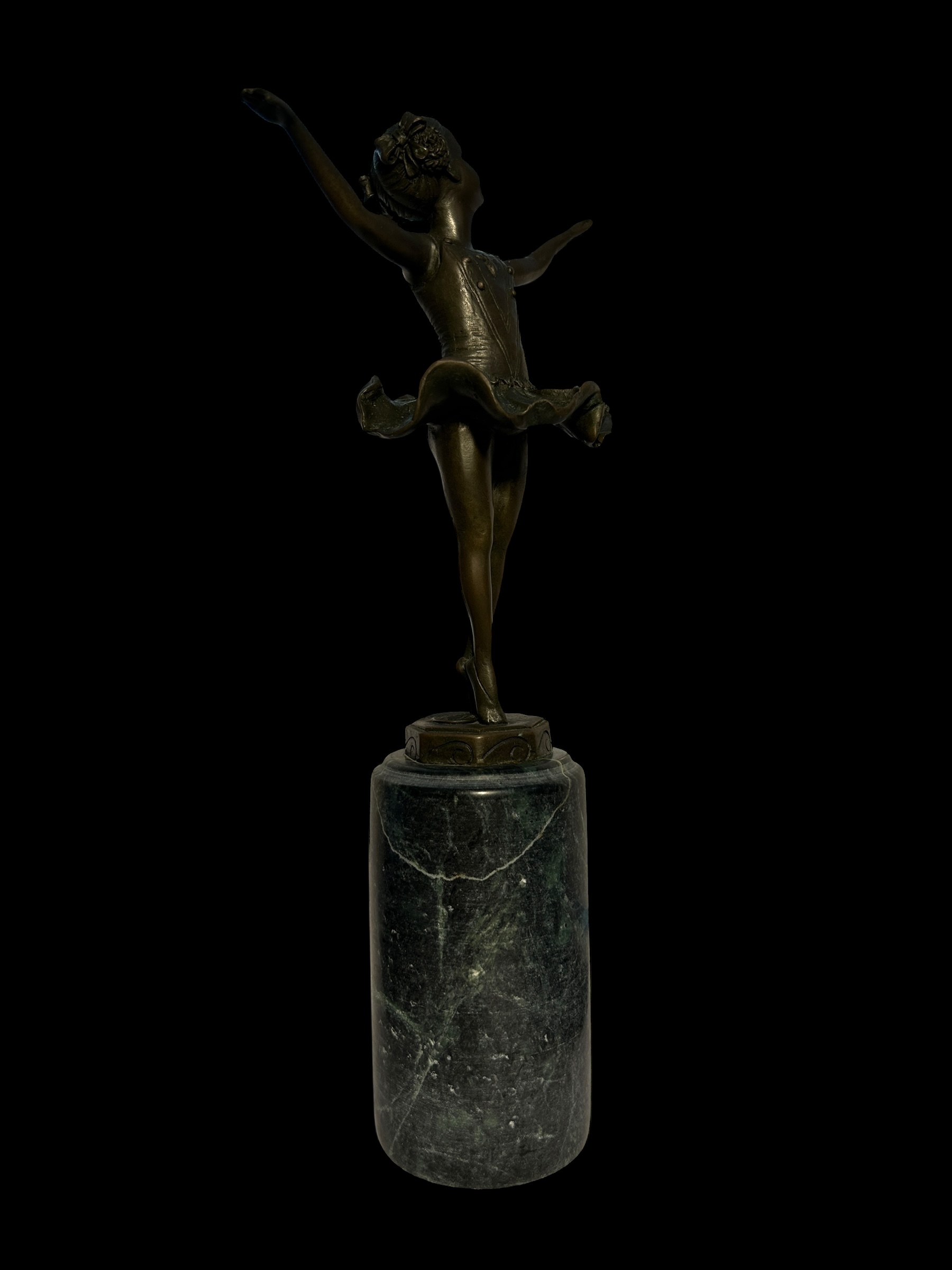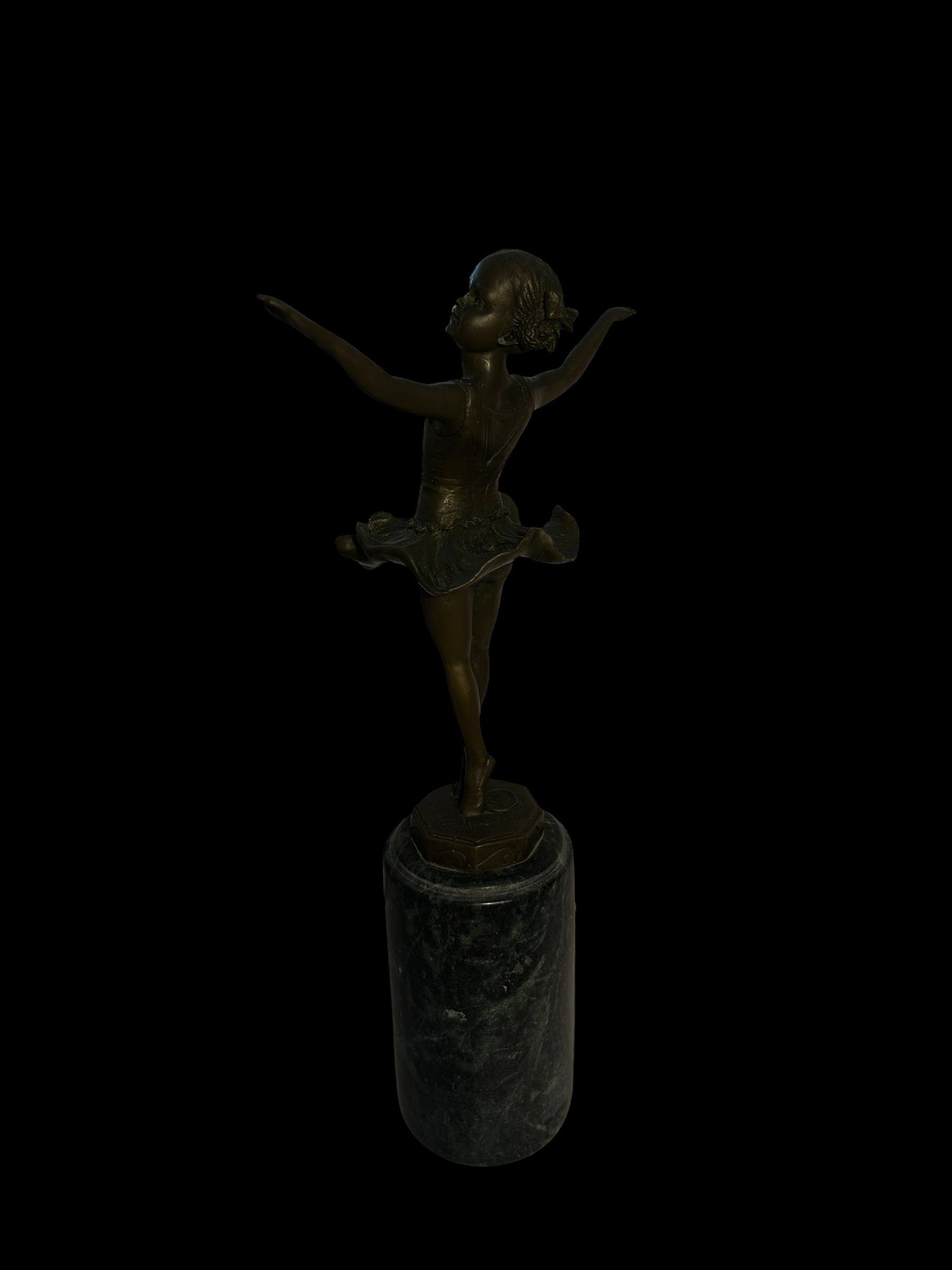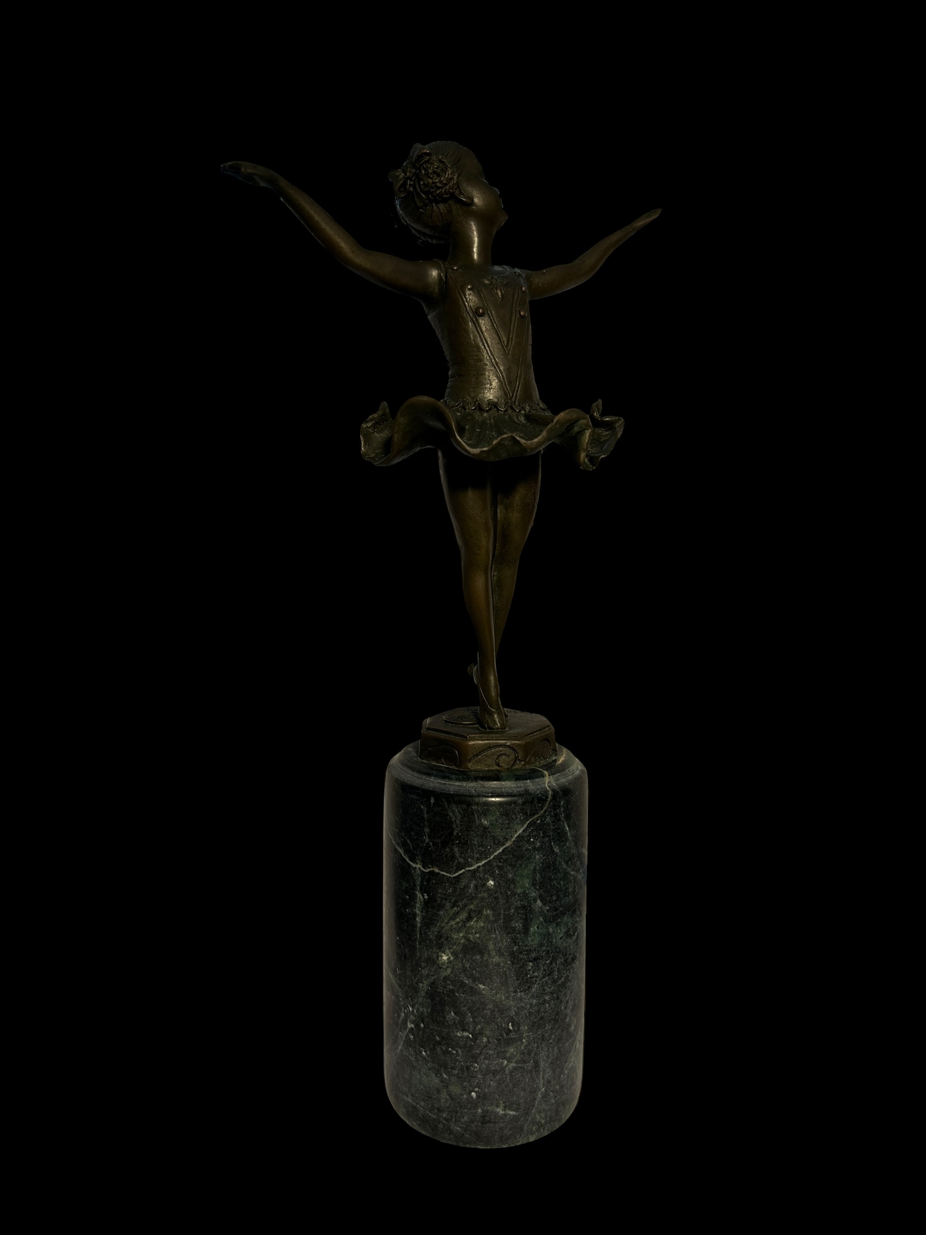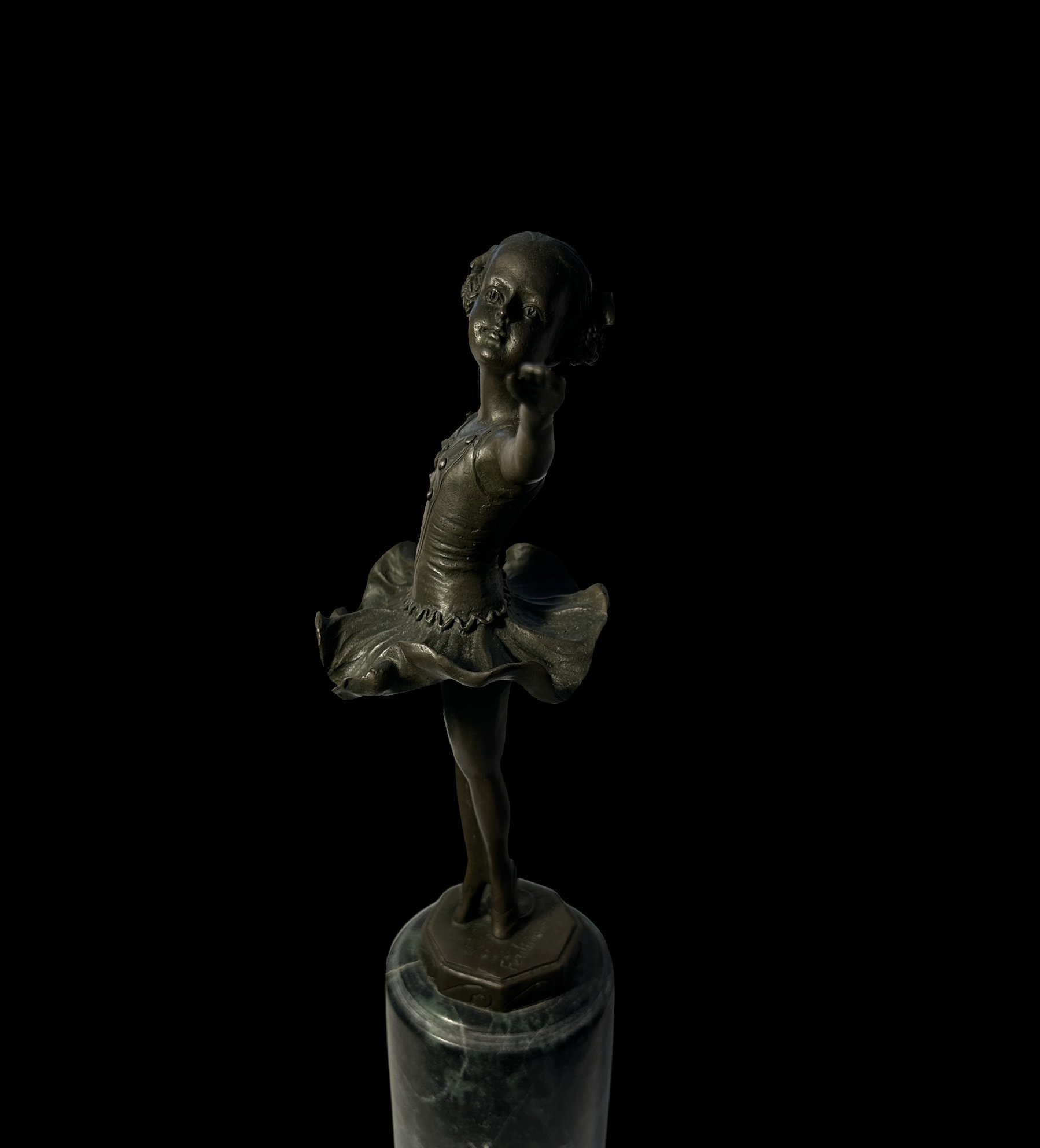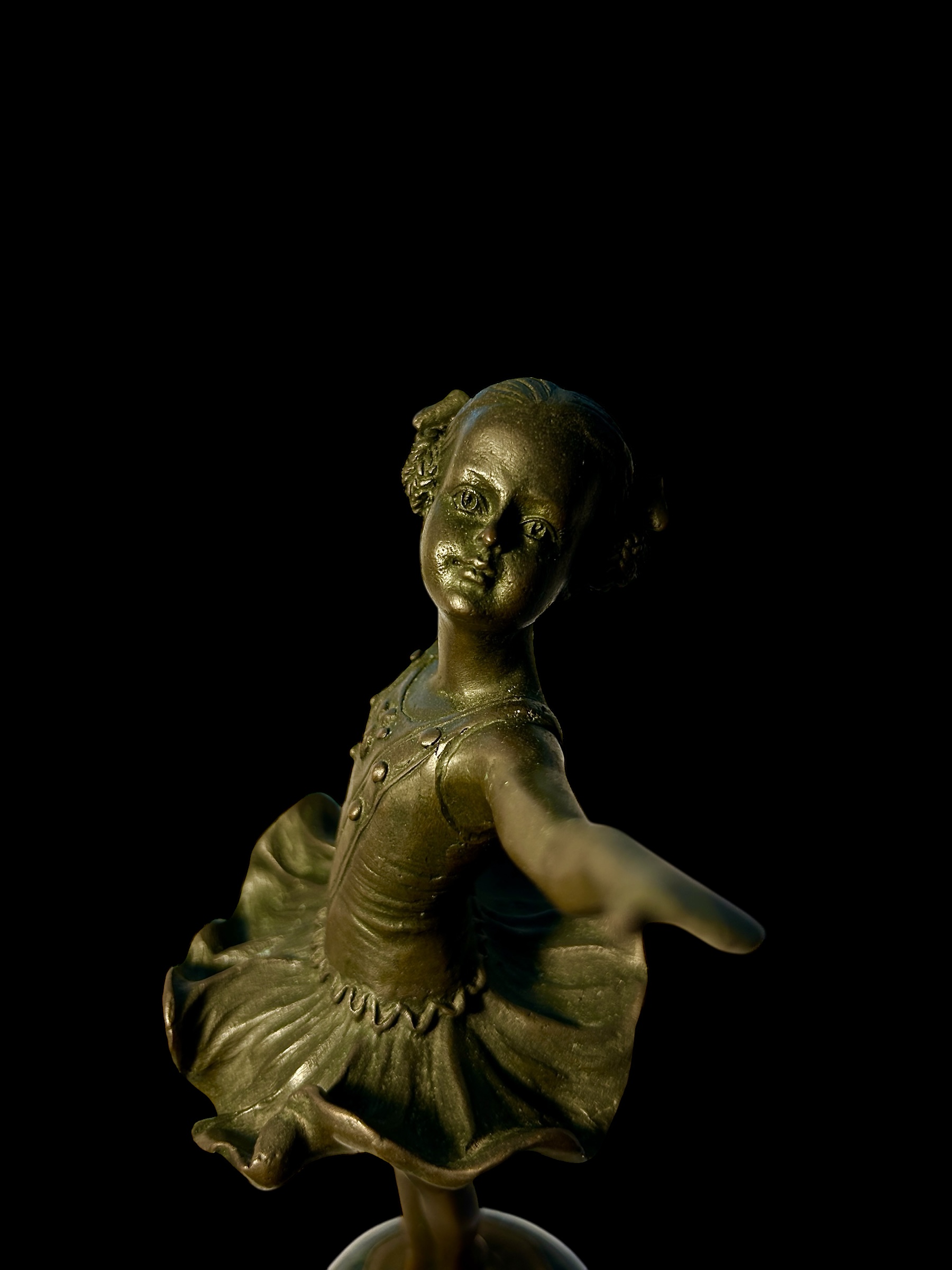 nàng vũ công bé nhỏ, thanh mảnh trong chiếc váy xòe cổ điển, được đỡ trên bệ đá cẩm thạch tròn, như một cột trụ nâng đỡ giấc mơ. mỗi đường cong trên thân tượng là một bản nhạc không lời, mỗi cái nghiêng đầu, giơ tay là một lời thì thầm của sự duyên dáng và cao quý.