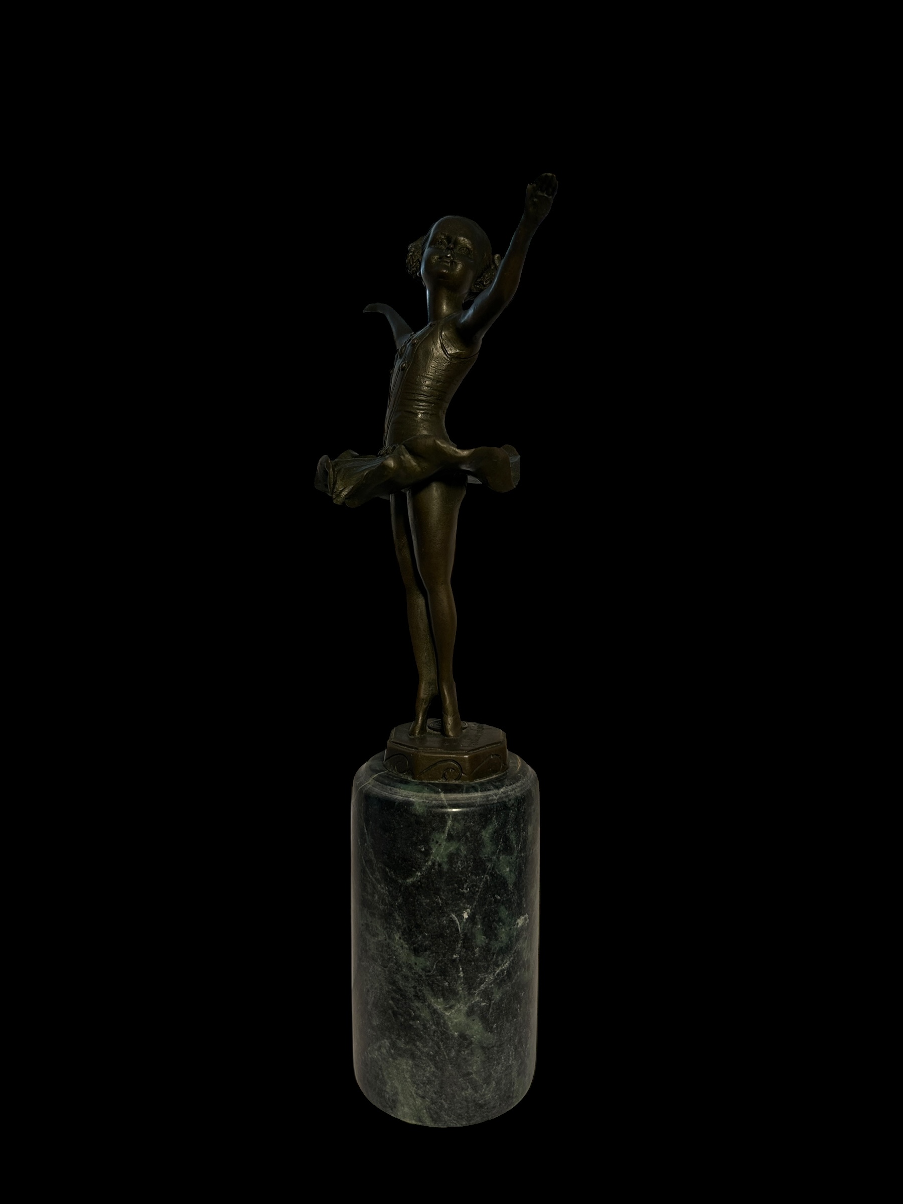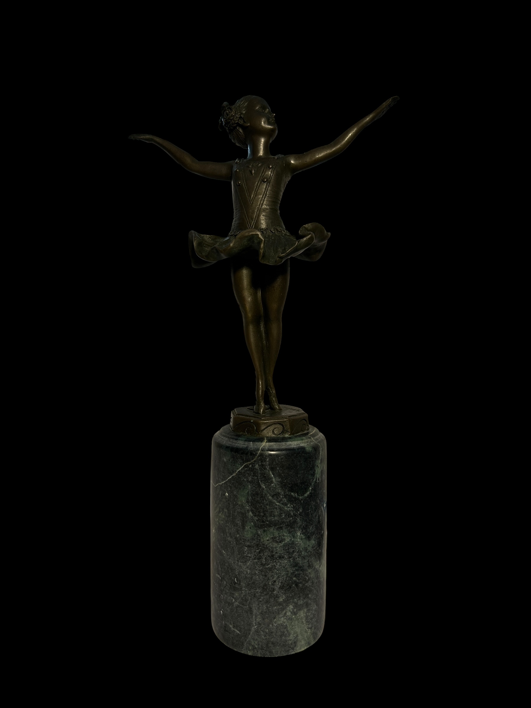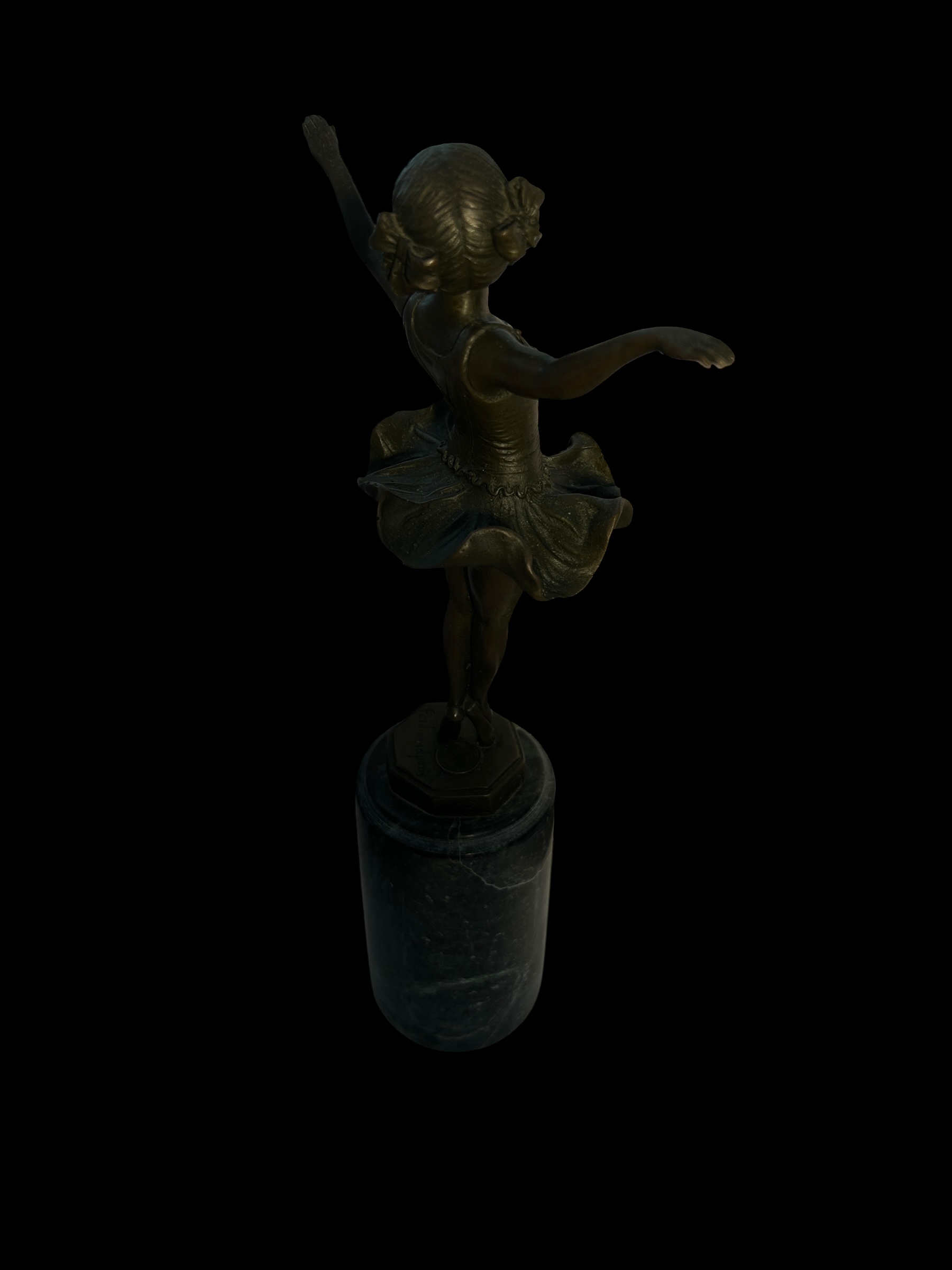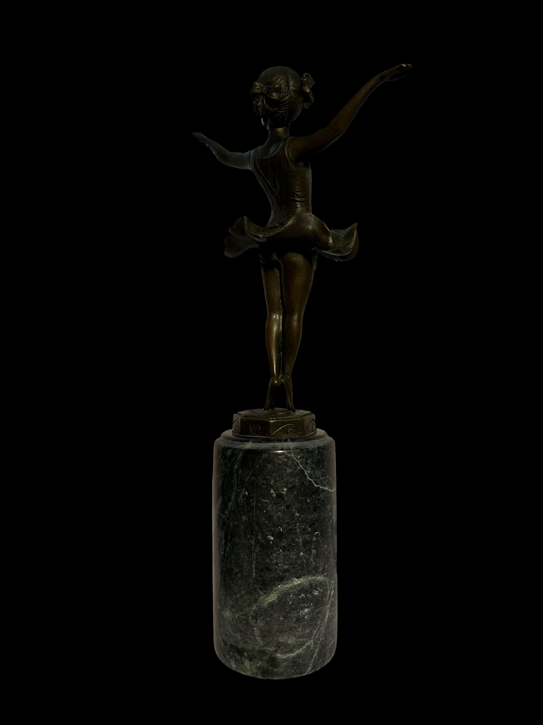 nàng vũ công bé nhỏ, thanh mảnh trong chiếc váy xòe cổ điển, được đỡ trên bệ đá cẩm thạch tròn, như một cột trụ nâng đỡ giấc mơ. mỗi đường cong trên thân tượng là một bản nhạc không lời, mỗi cái nghiêng đầu, giơ tay là một lời thì thầm của sự duyên dáng và cao quý.