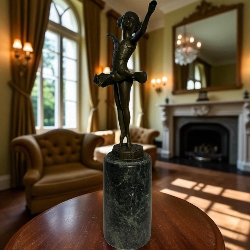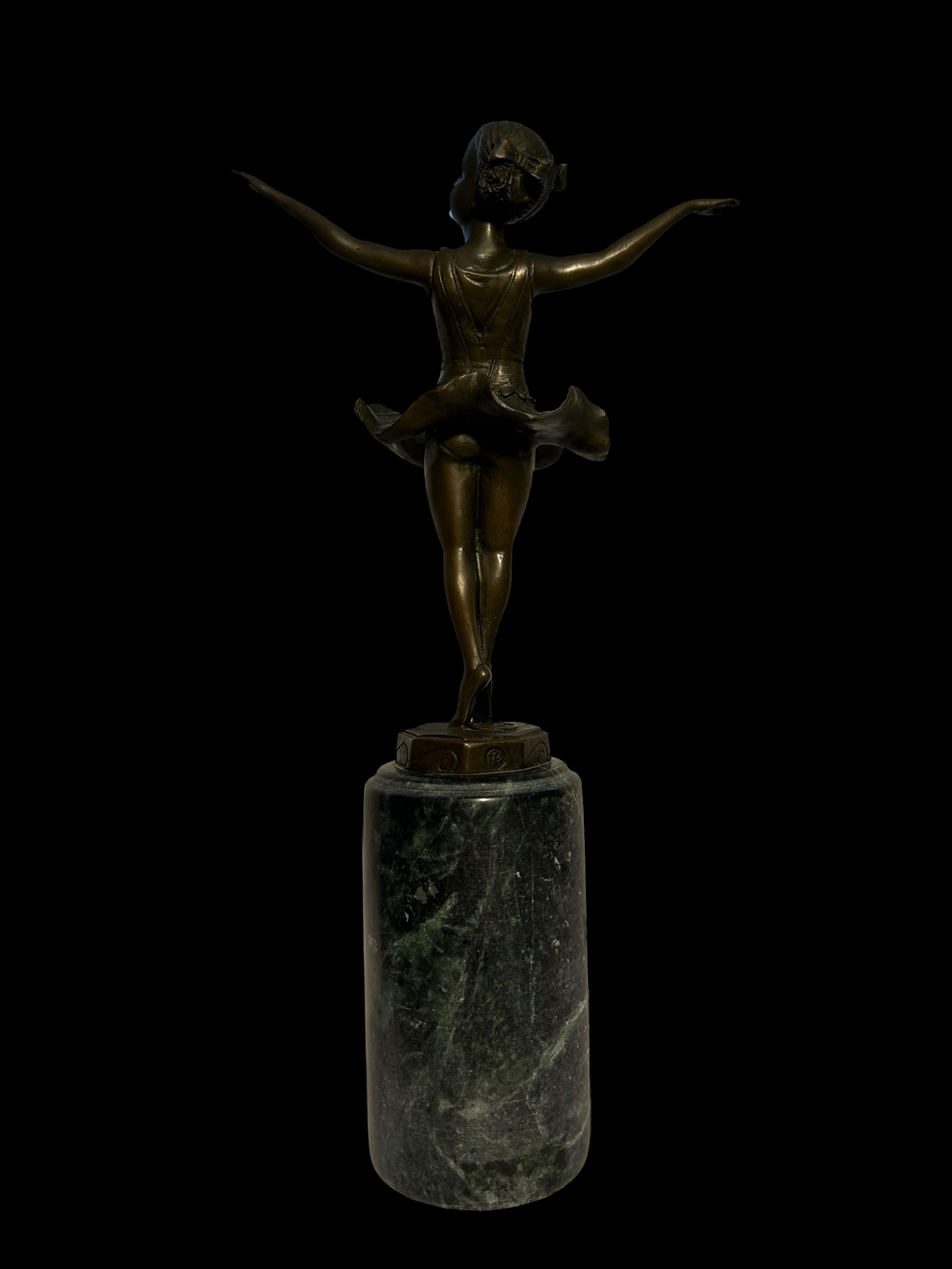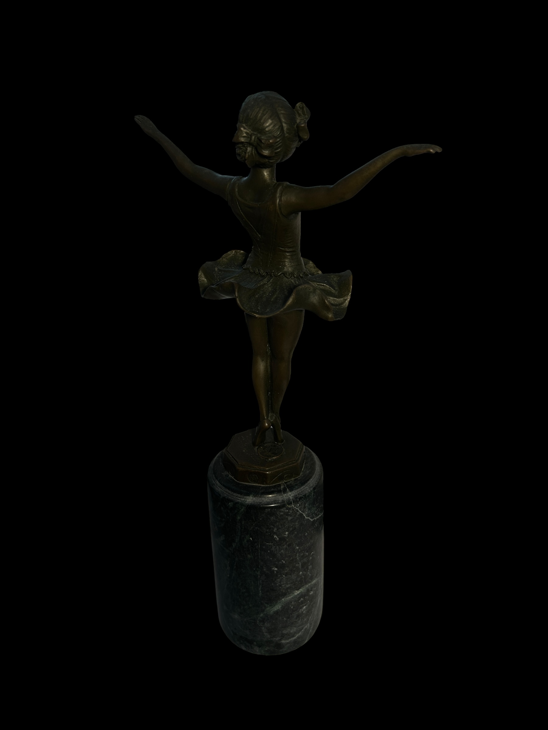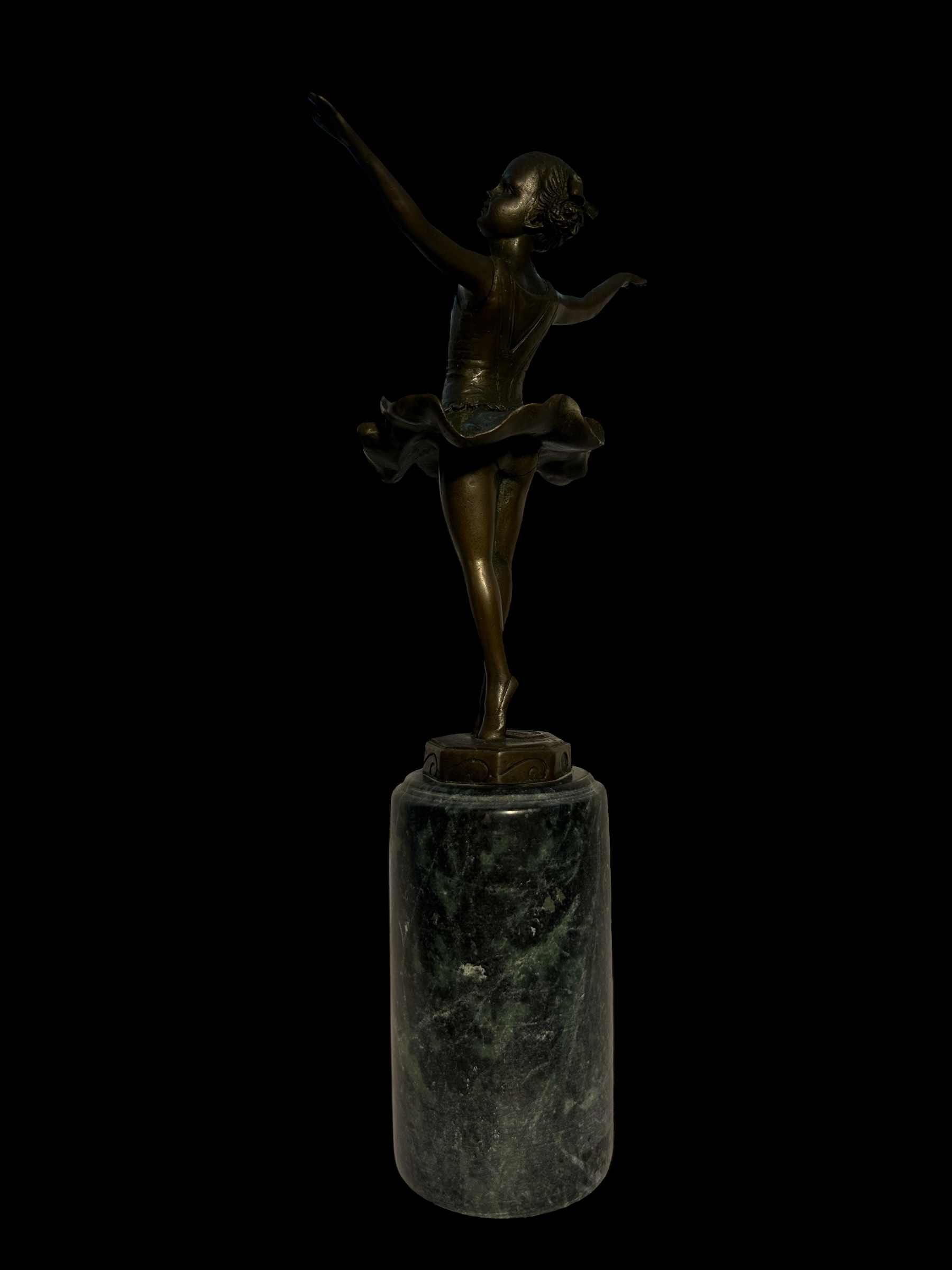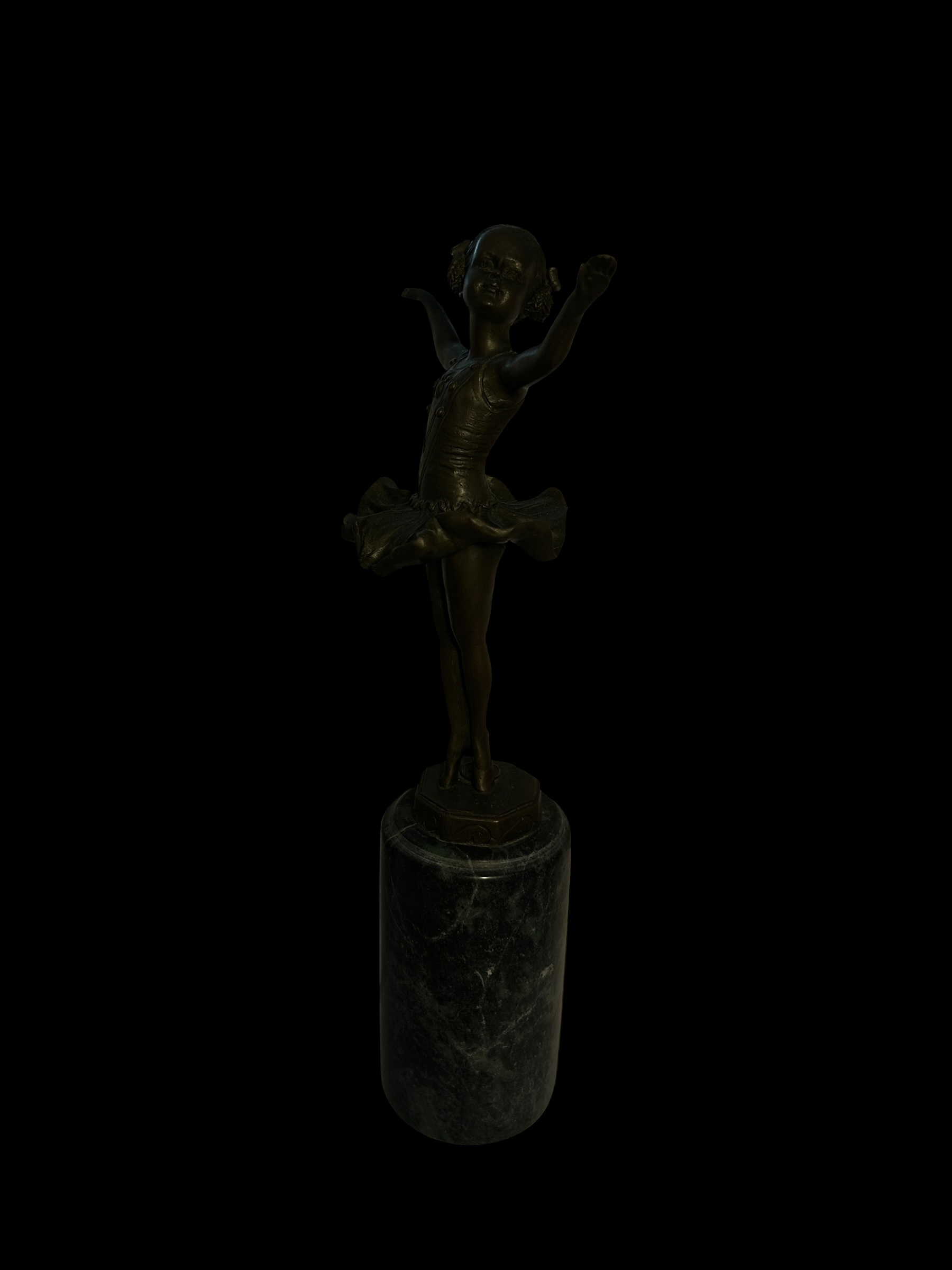 nàng vũ công bé nhỏ, thanh mảnh trong chiếc váy xòe cổ điển, được đỡ trên bệ đá cẩm thạch tròn, như một cột trụ nâng đỡ giấc mơ. mỗi đường cong trên thân tượng là một bản nhạc không lời, mỗi cái nghiêng đầu, giơ tay là một lời thì thầm của sự duyên dáng và cao quý.