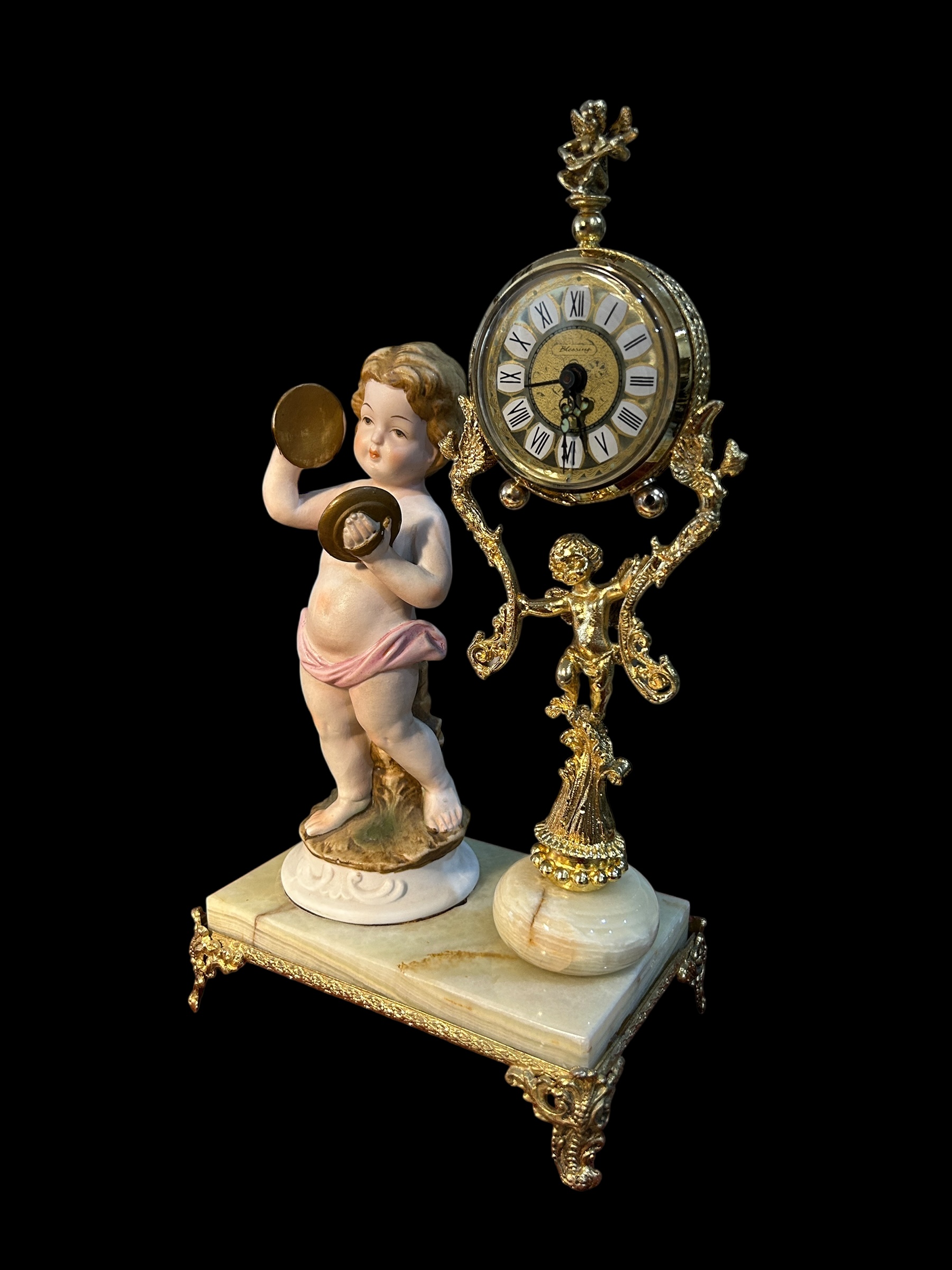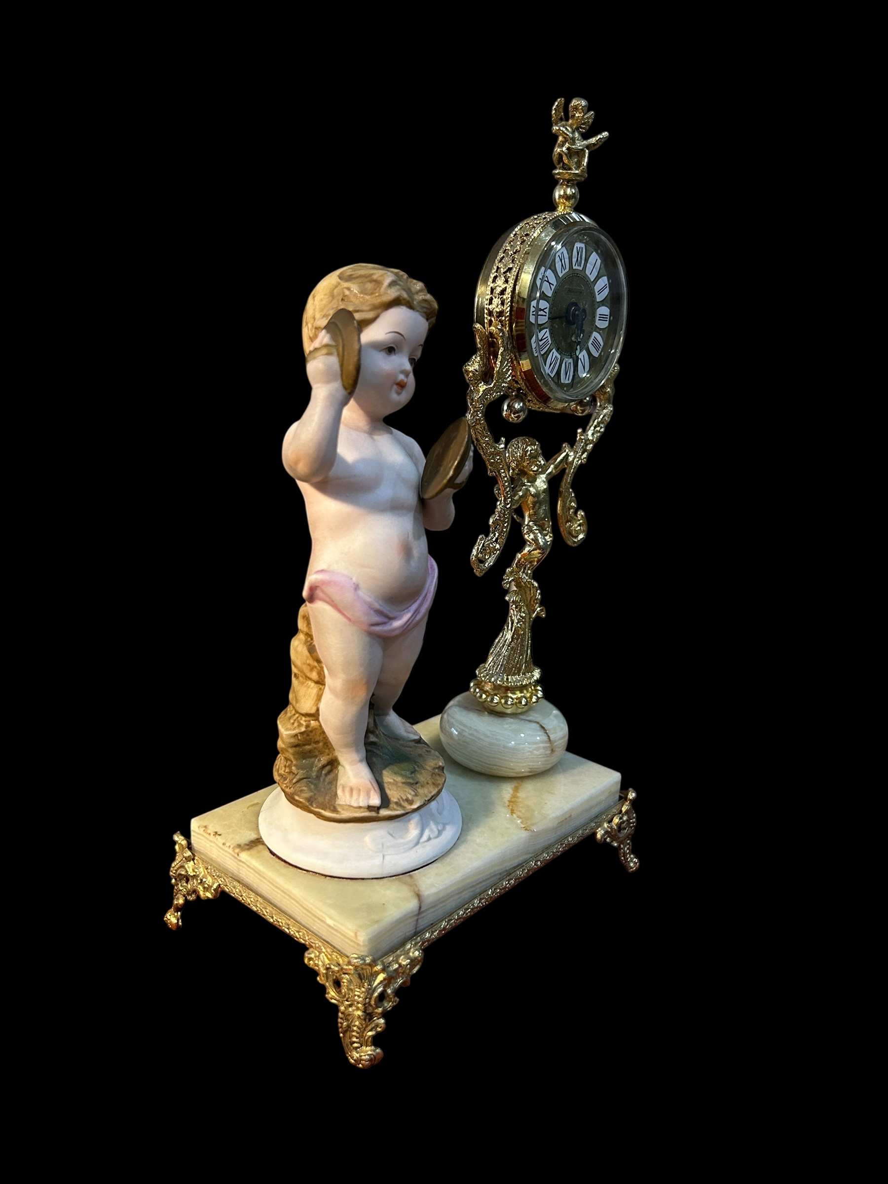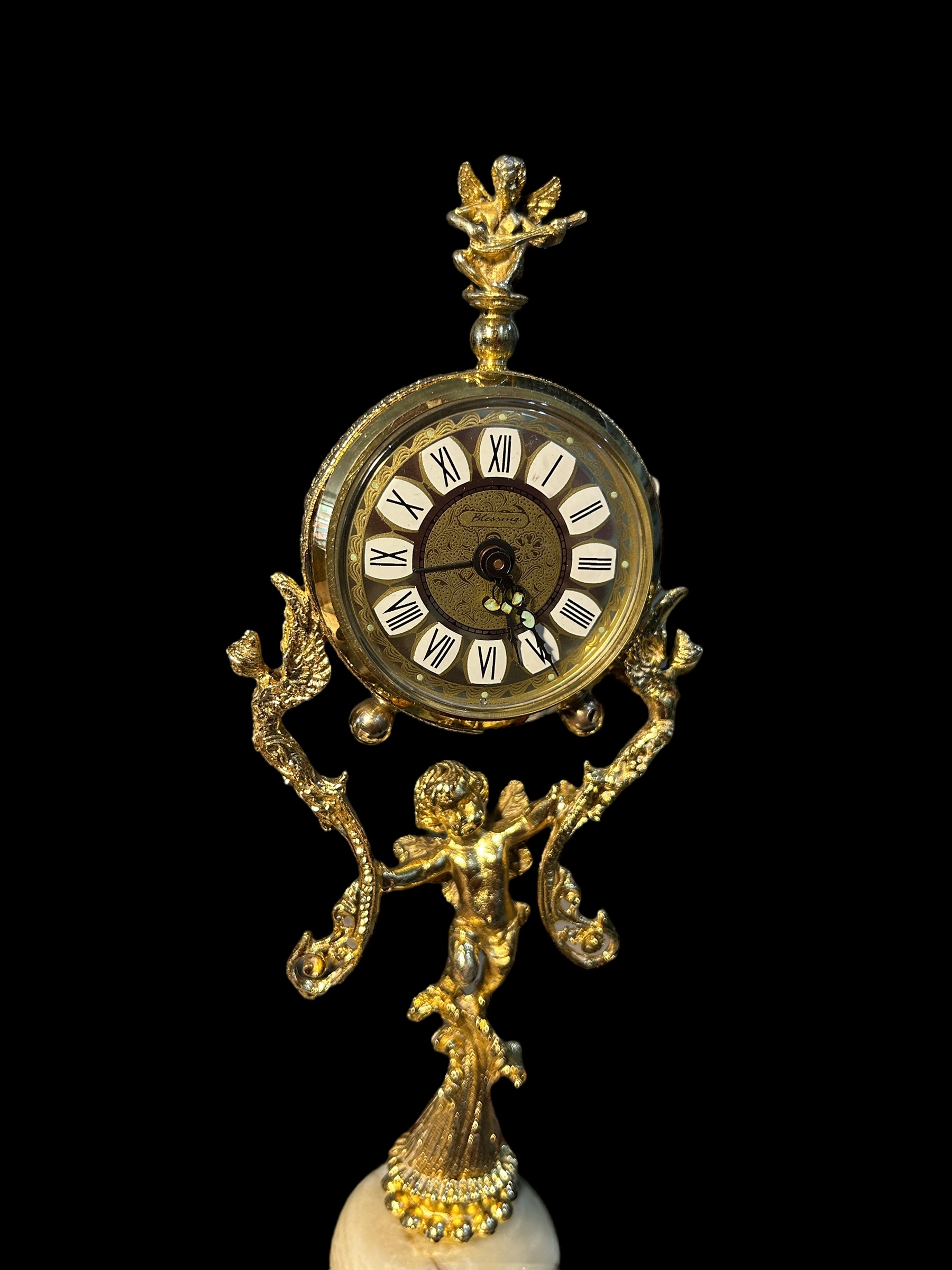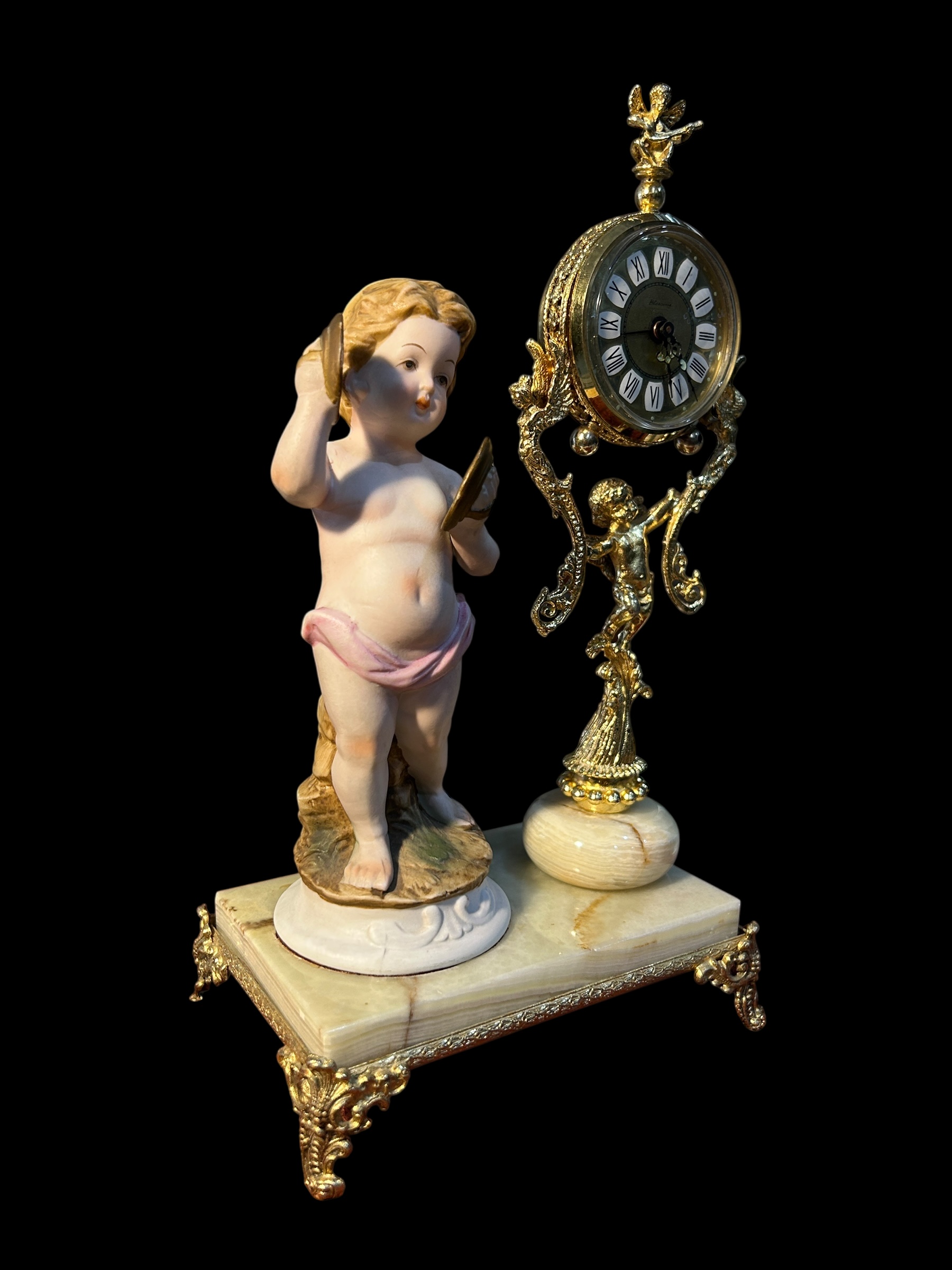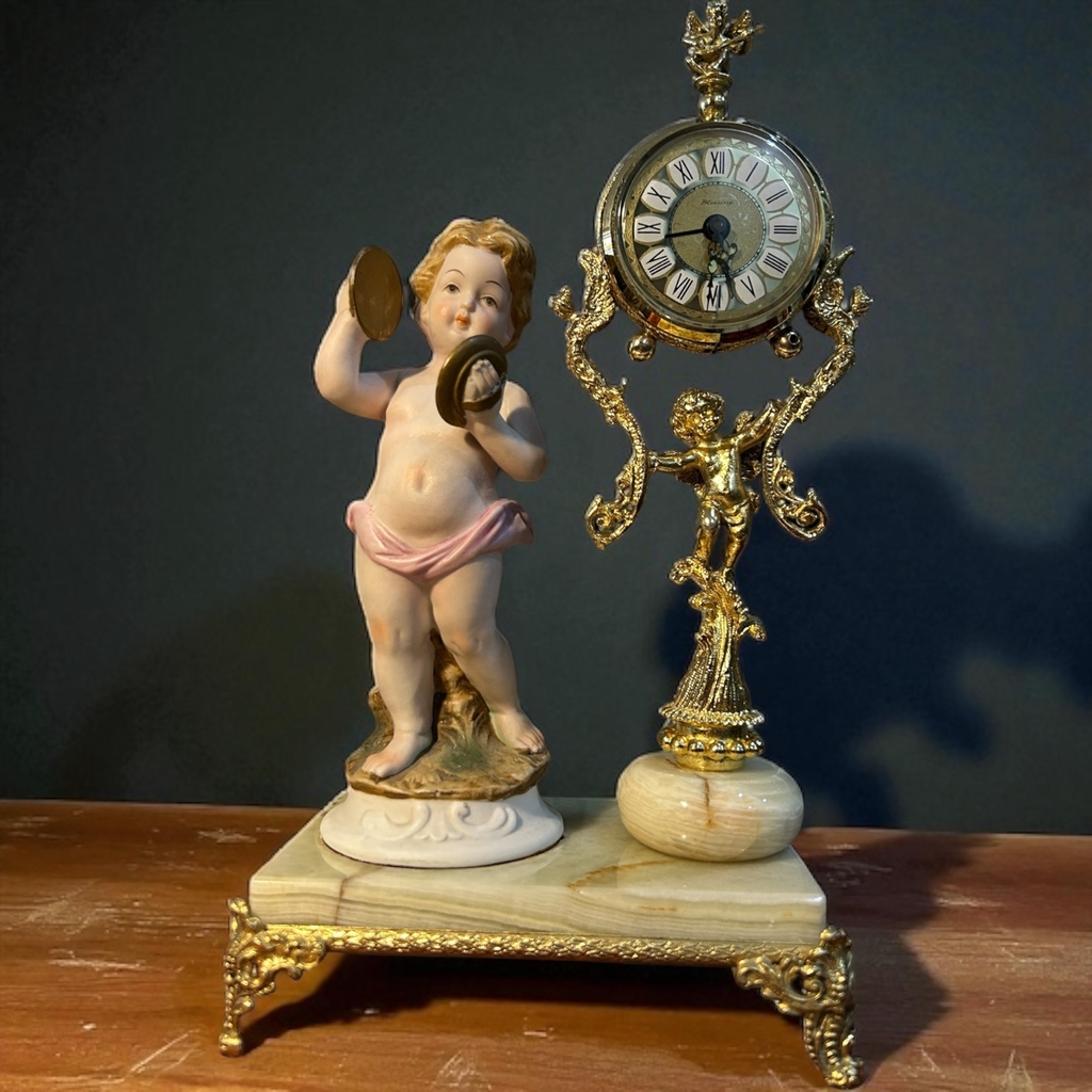 Hãy yên ngưỡng đồng hồ nghệ thuật này – nơi thời gian và nghệ thuật hòa quyện trong vũ khúc cổ điển. Tượng thiên thần chiến đấu trống tay trong tạo hình búp bê sứ, bên cạnh bộ máy đồng hồ mạ vàng tinh cường được hỗ trợ bởi họa tiết baroque cầu kỳ – Tất cả đặt trên đế đá ngọc thạch cứng chãi, sang trọng.