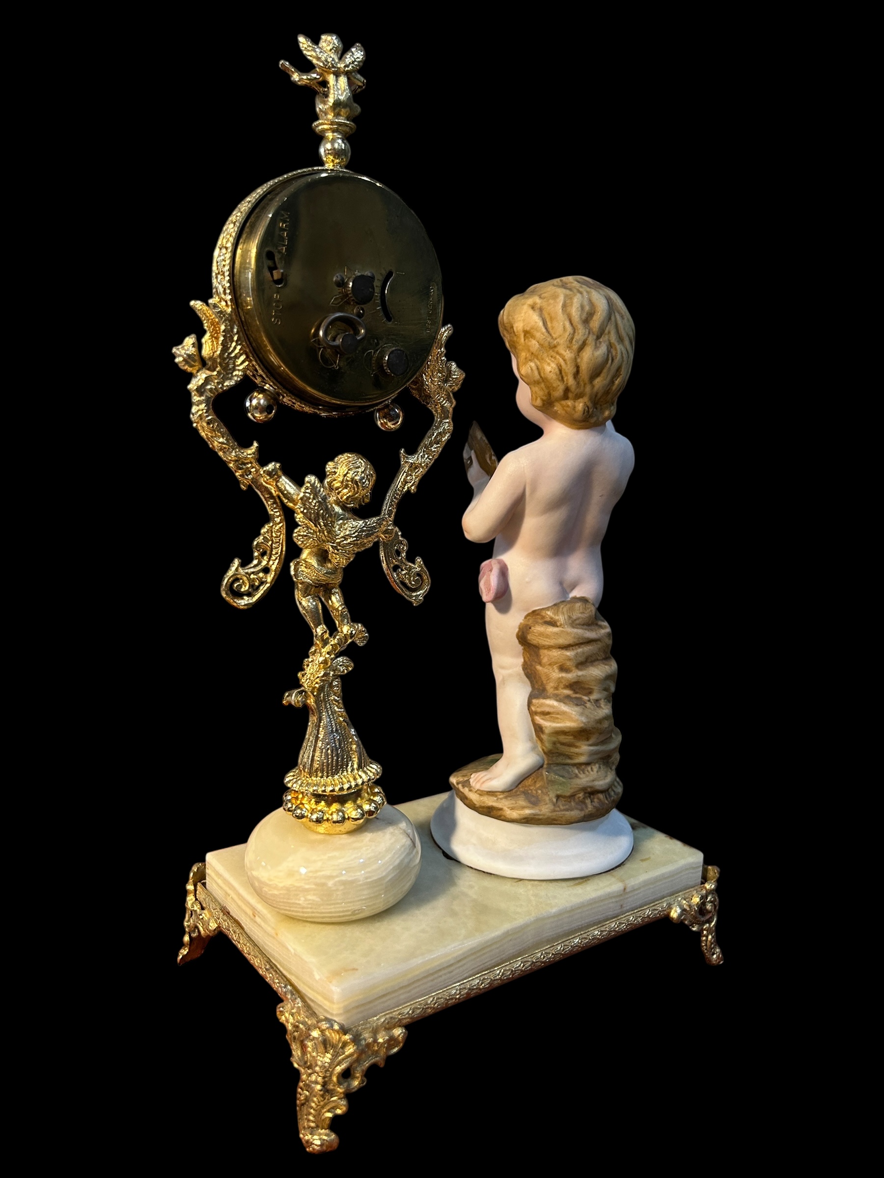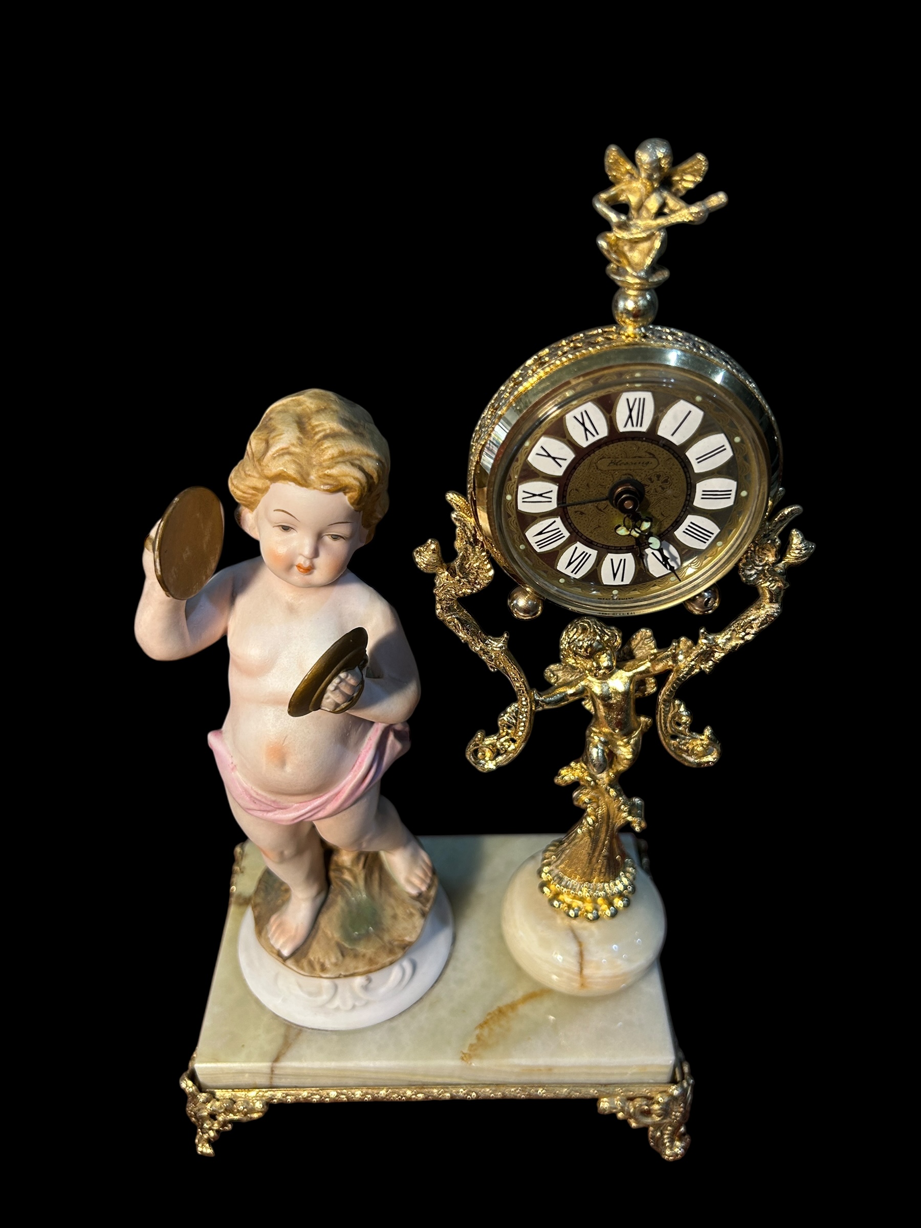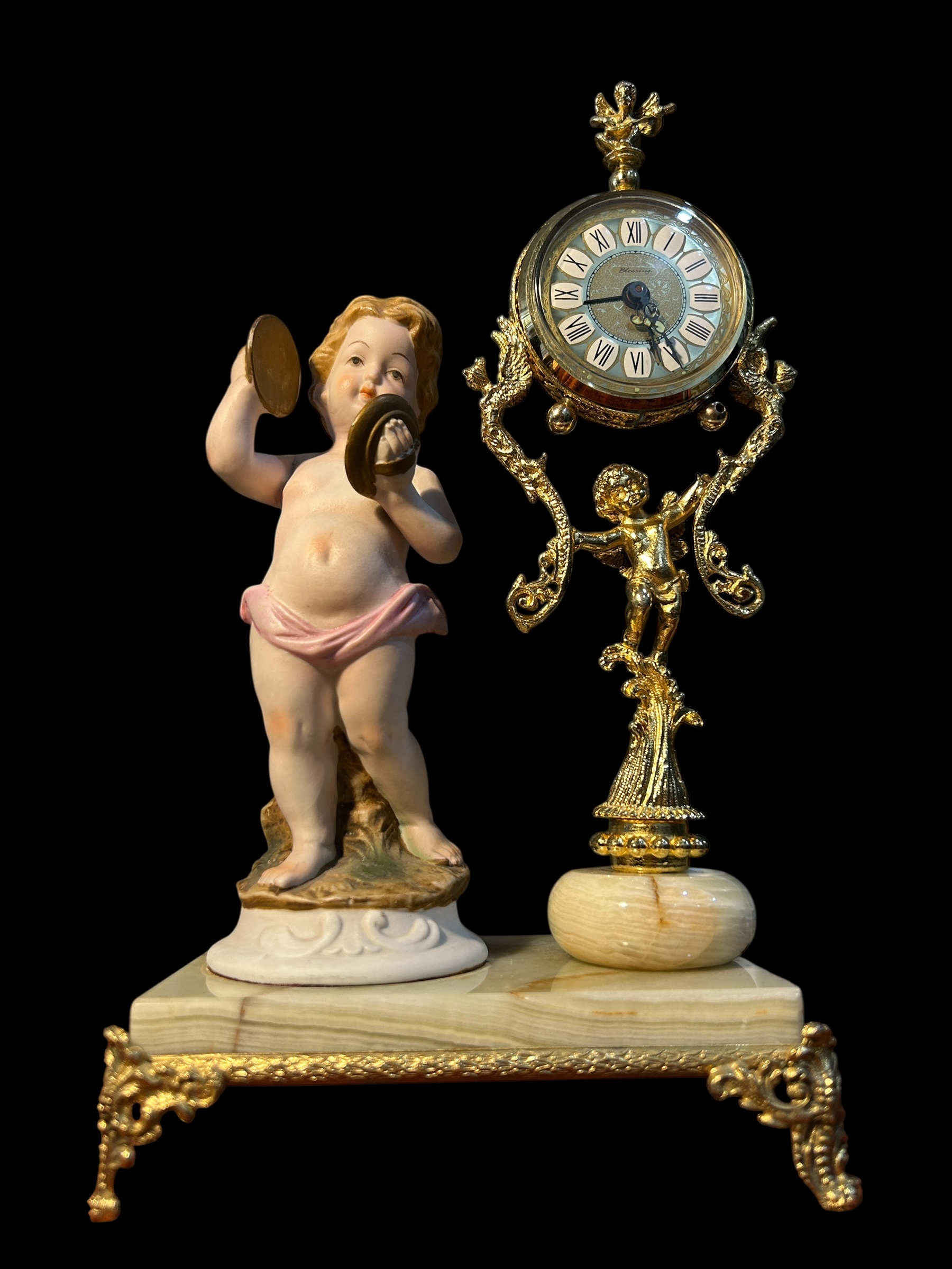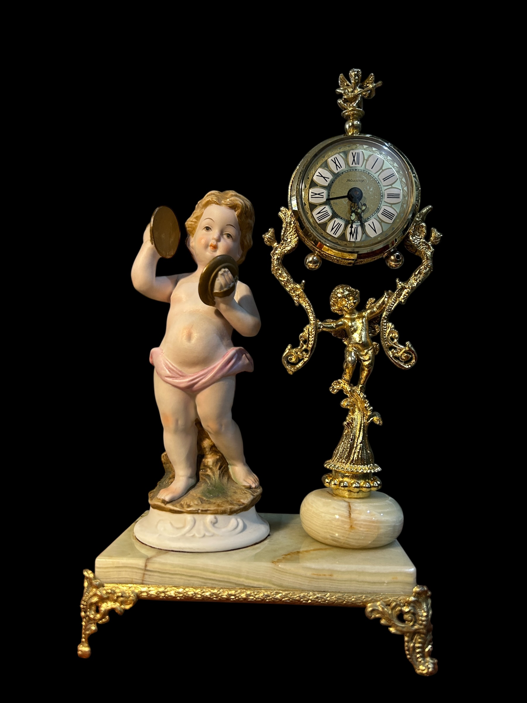 Hãy yên ngưỡng đồng hồ nghệ thuật này – nơi thời gian và nghệ thuật hòa quyện trong vũ khúc cổ điển. Tượng thiên thần chiến đấu trống tay trong tạo hình búp bê sứ, bên cạnh bộ máy đồng hồ mạ vàng tinh cường được hỗ trợ bởi họa tiết baroque cầu kỳ – Tất cả đặt trên đế đá ngọc thạch cứng chãi, sang trọng.