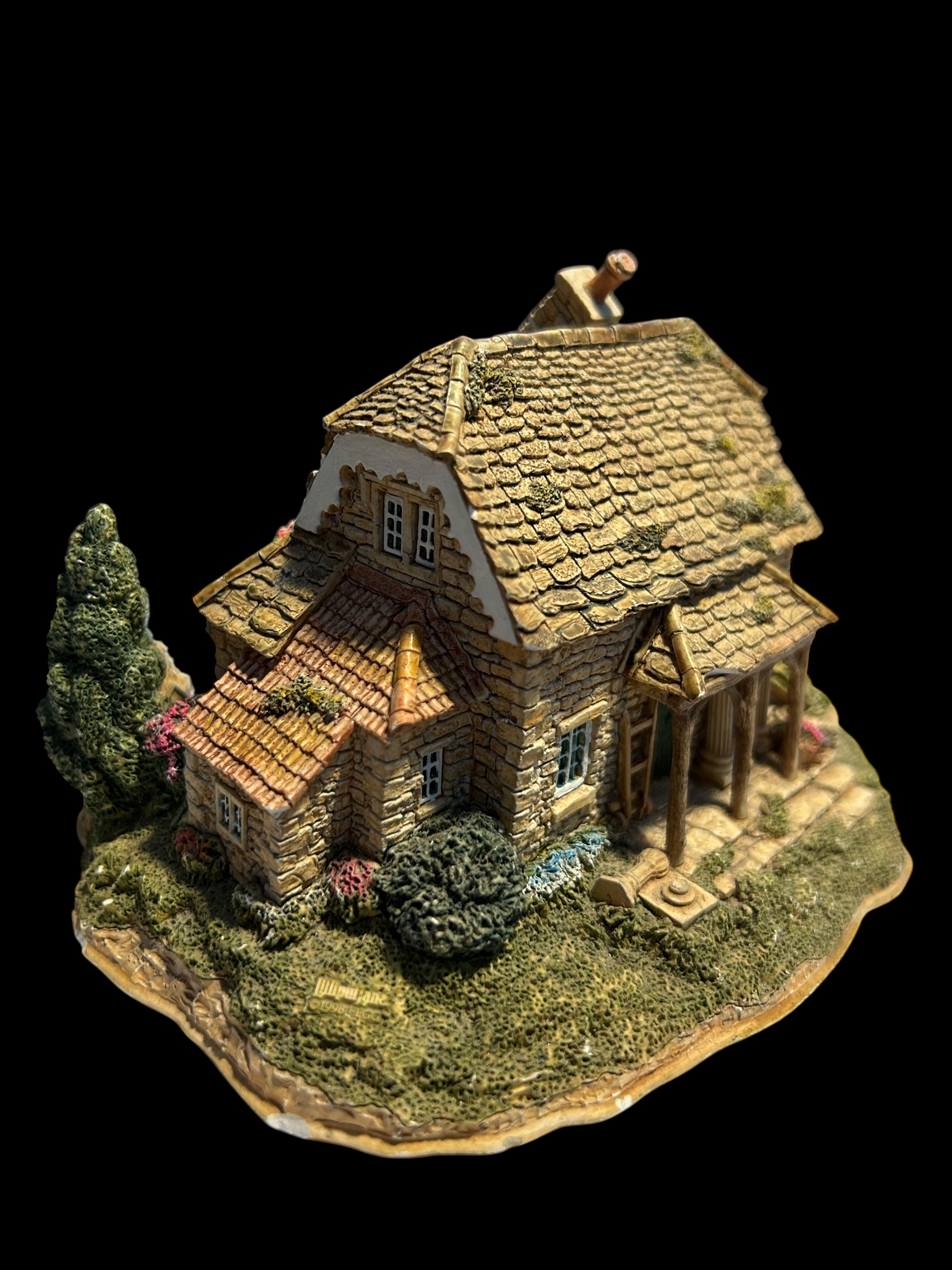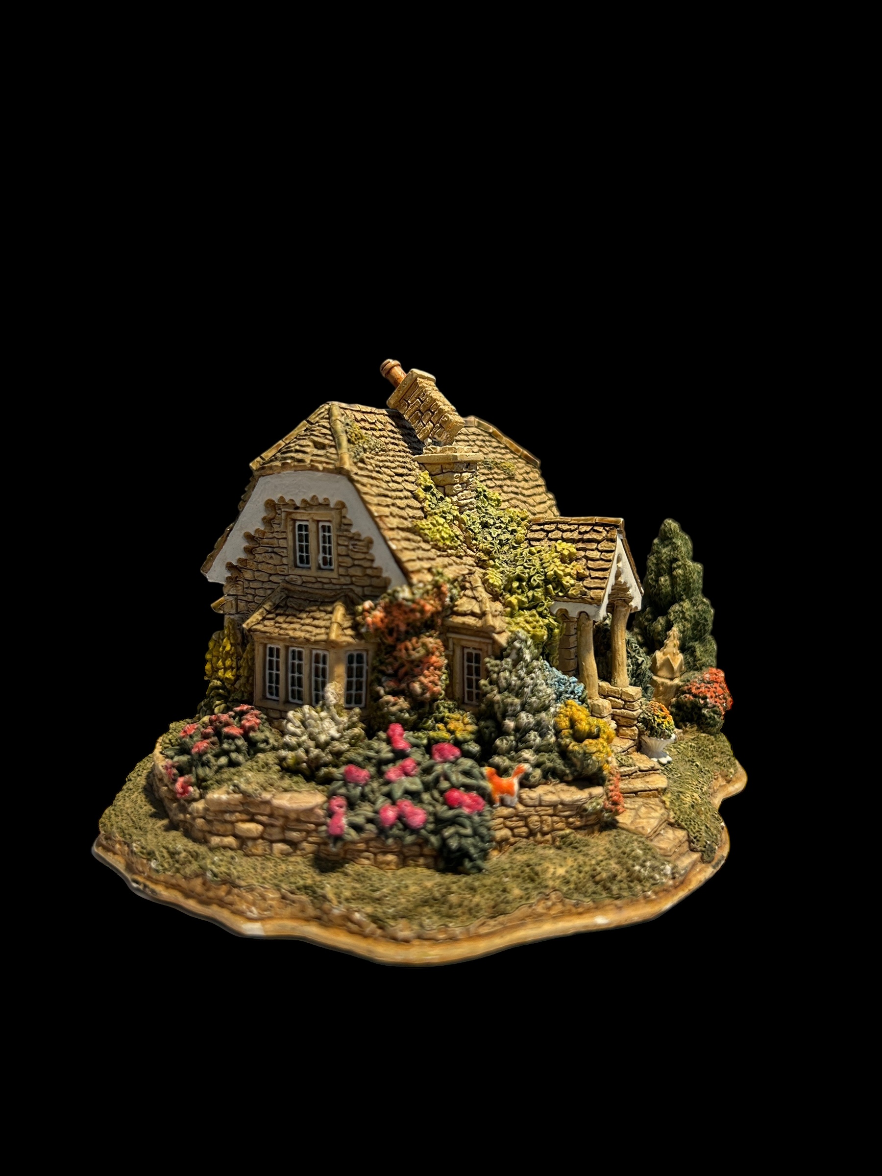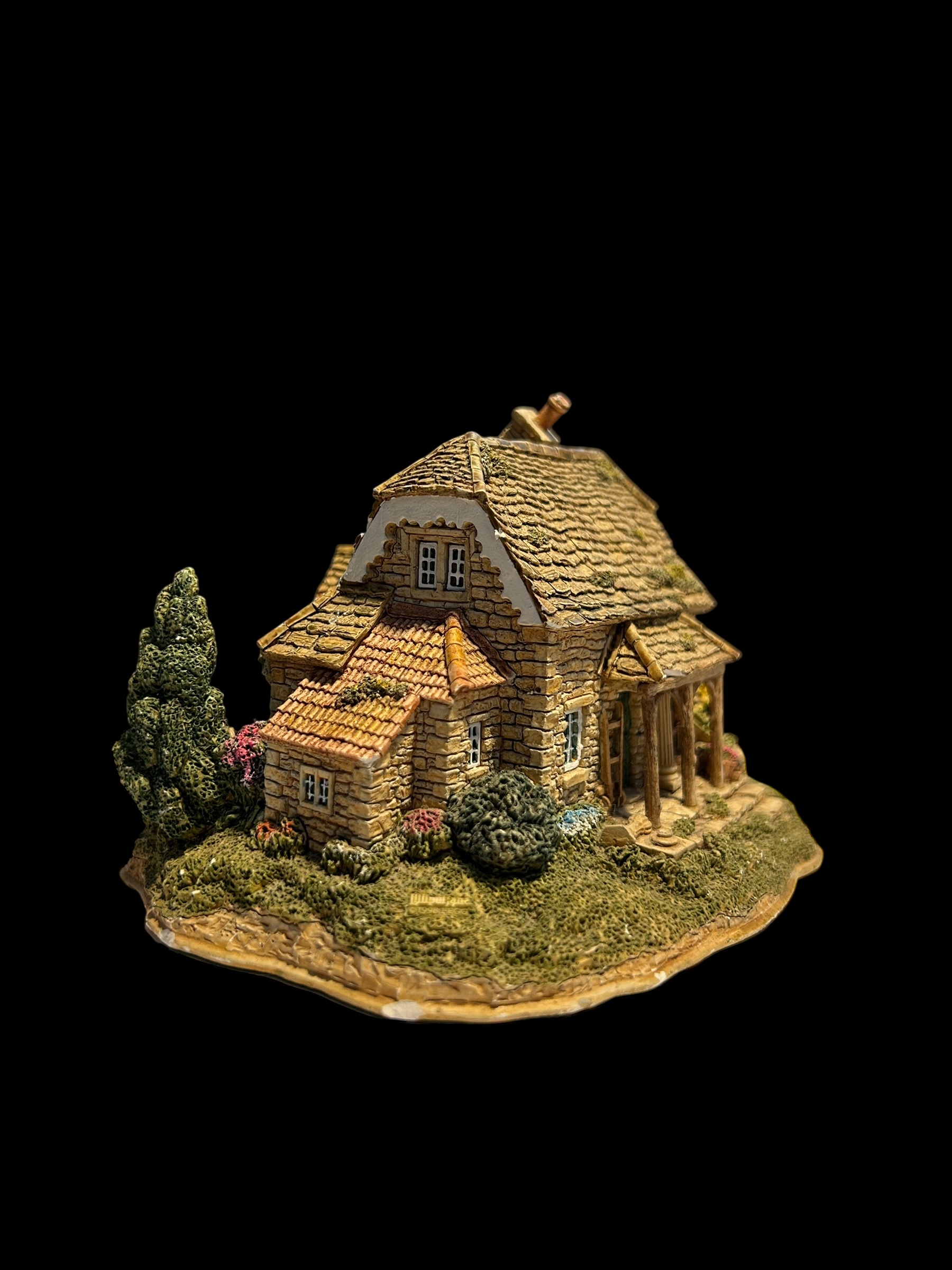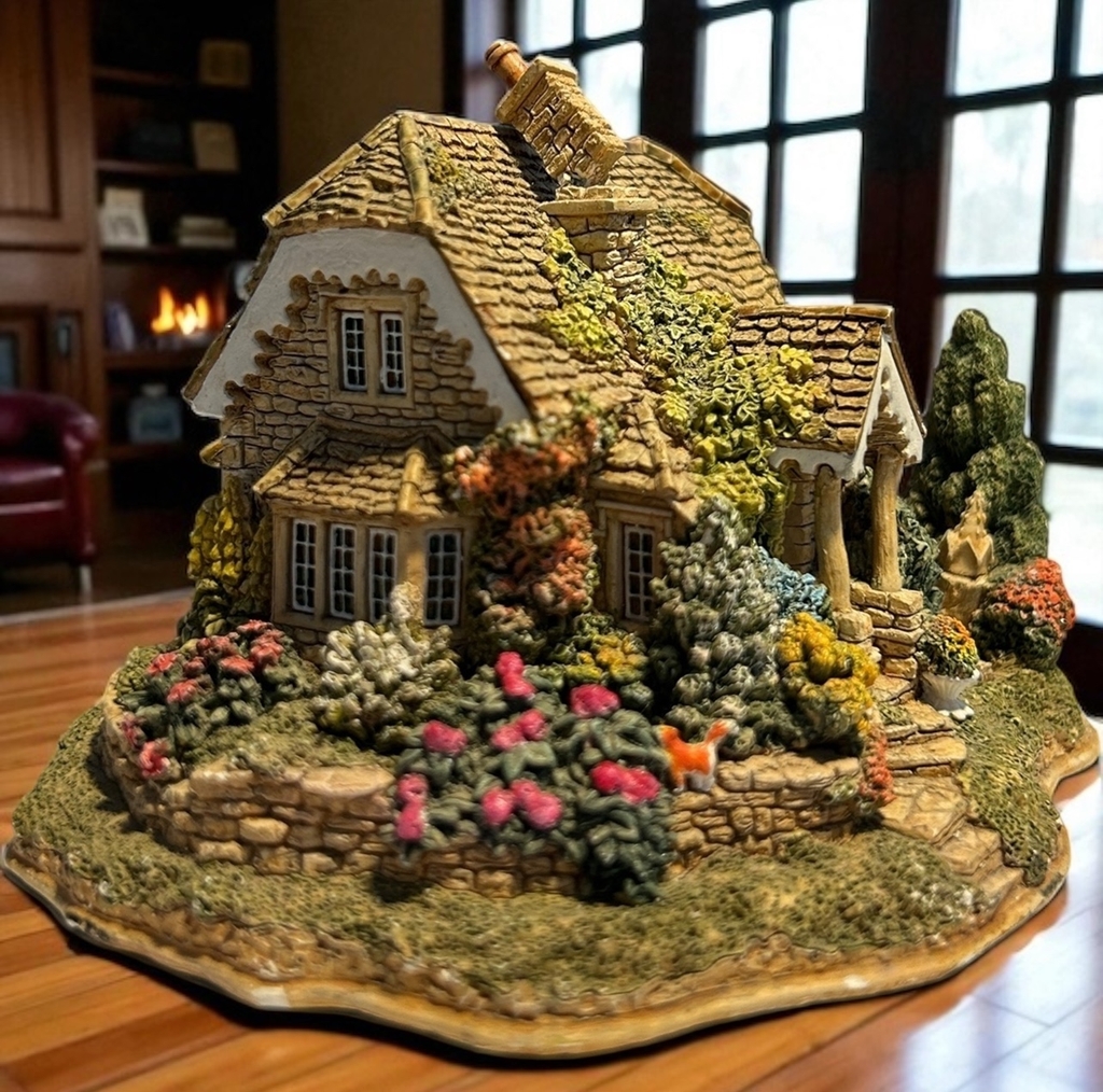 Tuyệt phẩm bạn đang sở hữu là một mô hình thu nhỏ mang phong cách đồng quê nước Anh – cụ thể là dòng tượng David Winter Cottages, được thiết kế bởi nghệ nhân David Winter và sản xuất bởi công ty John Hine Limited từ những năm 1979 đến cuối thập niên 1990. Những tác phẩm này nổi danh vì độ chi tiết kỳ công, mái ngói xưa cũ, đá sa thạch vàng, và những khu vườn nở rộ như cổ tích.