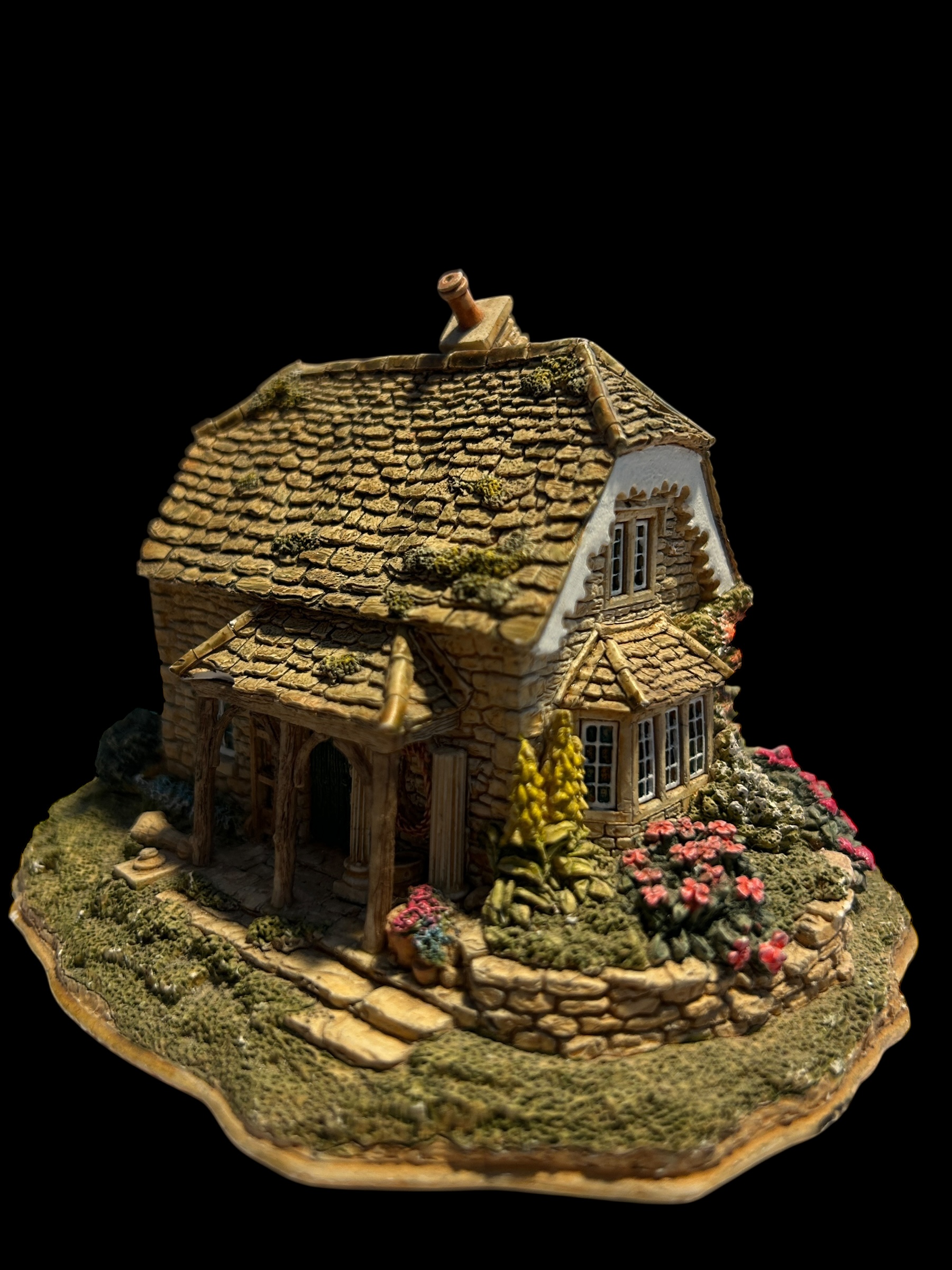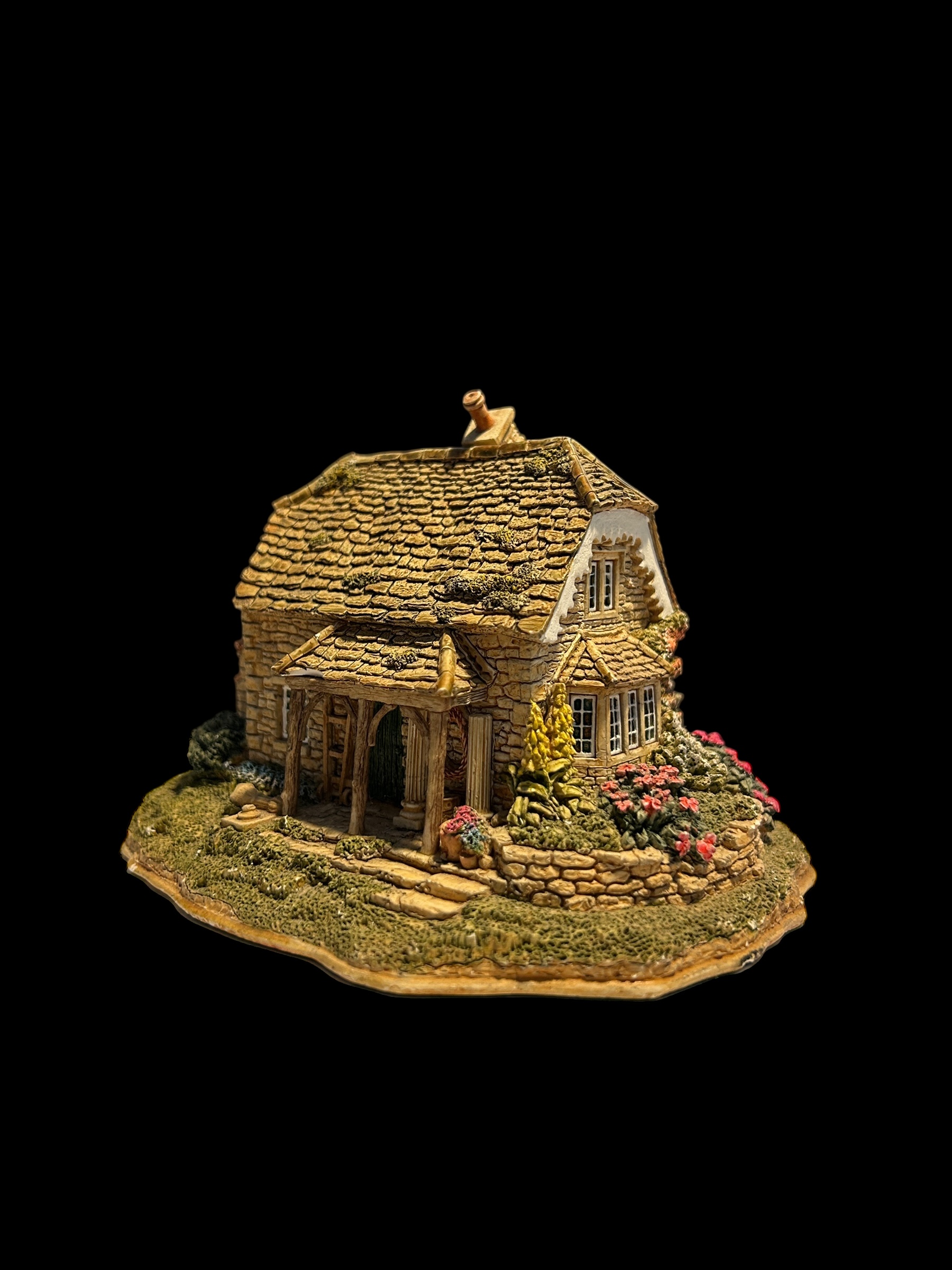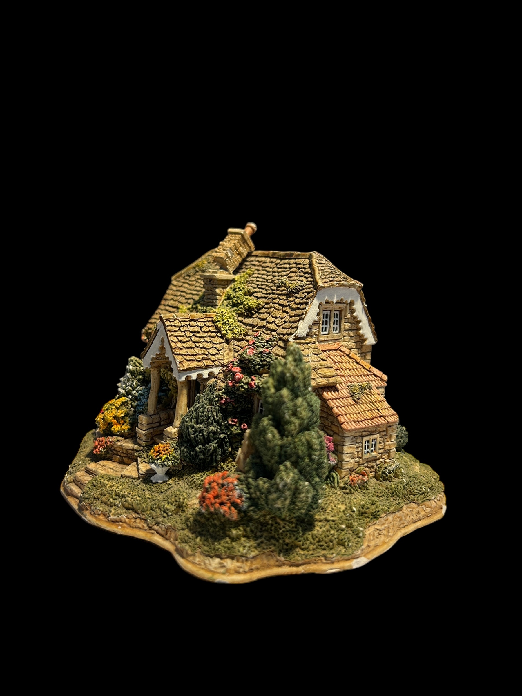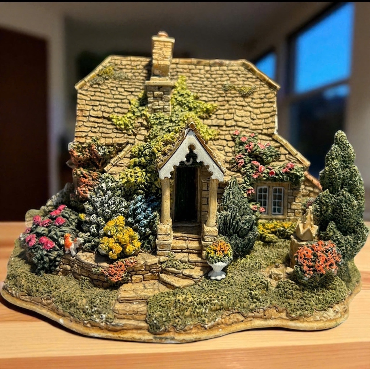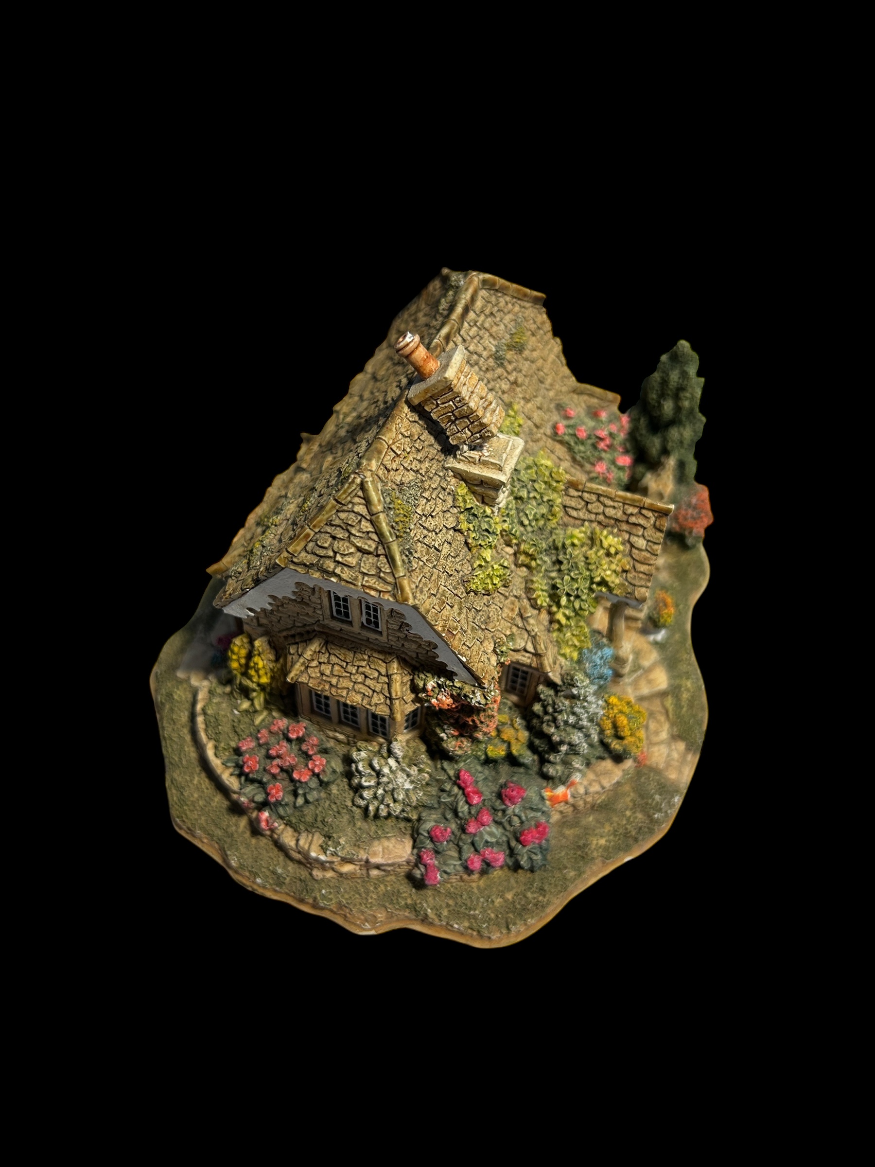 Tuyệt phẩm bạn đang sở hữu là một mô hình thu nhỏ mang phong cách đồng quê nước Anh – cụ thể là dòng tượng David Winter Cottages, được thiết kế bởi nghệ nhân David Winter và sản xuất bởi công ty John Hine Limited từ những năm 1979 đến cuối thập niên 1990. Những tác phẩm này nổi danh vì độ chi tiết kỳ công, mái ngói xưa cũ, đá sa thạch vàng, và những khu vườn nở rộ như cổ tích.