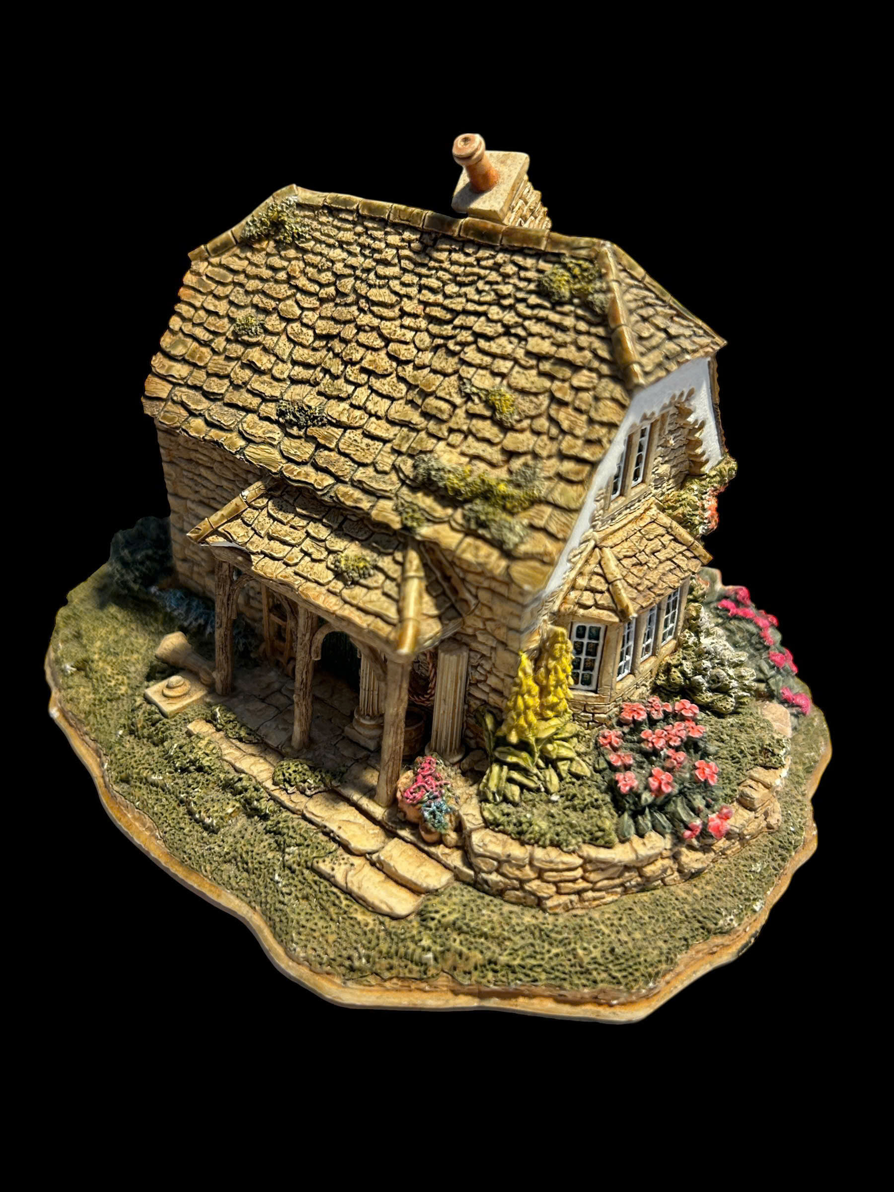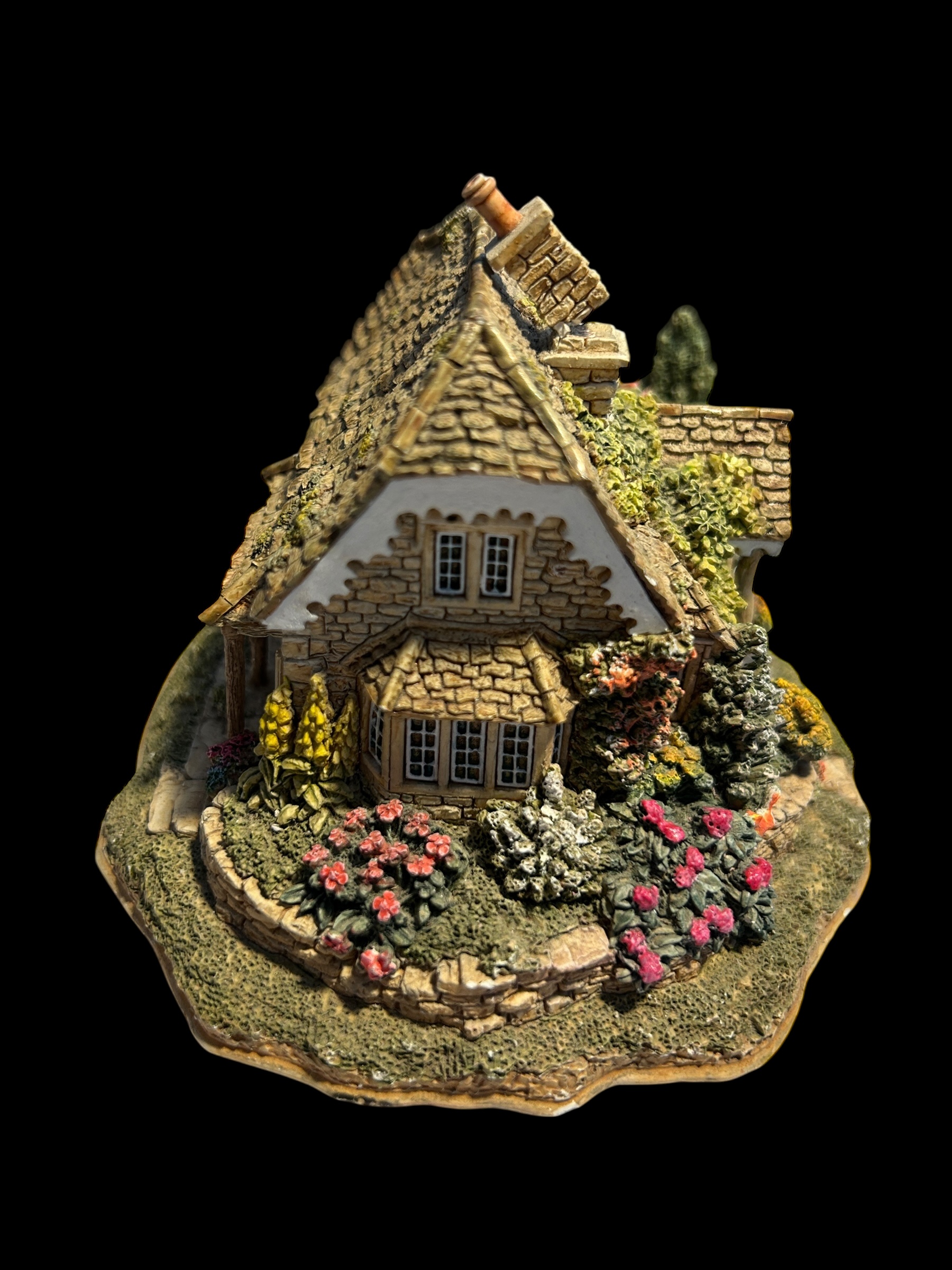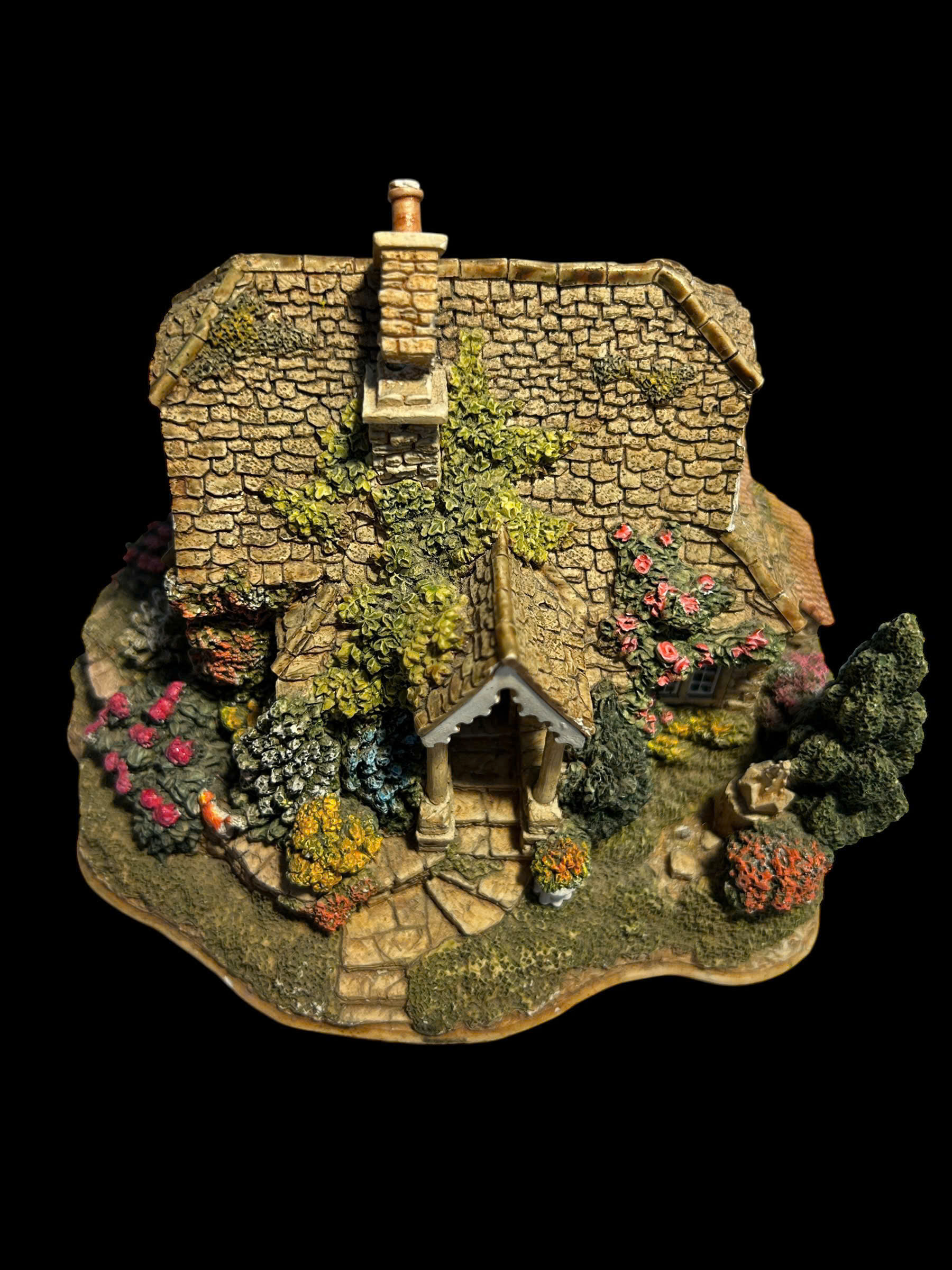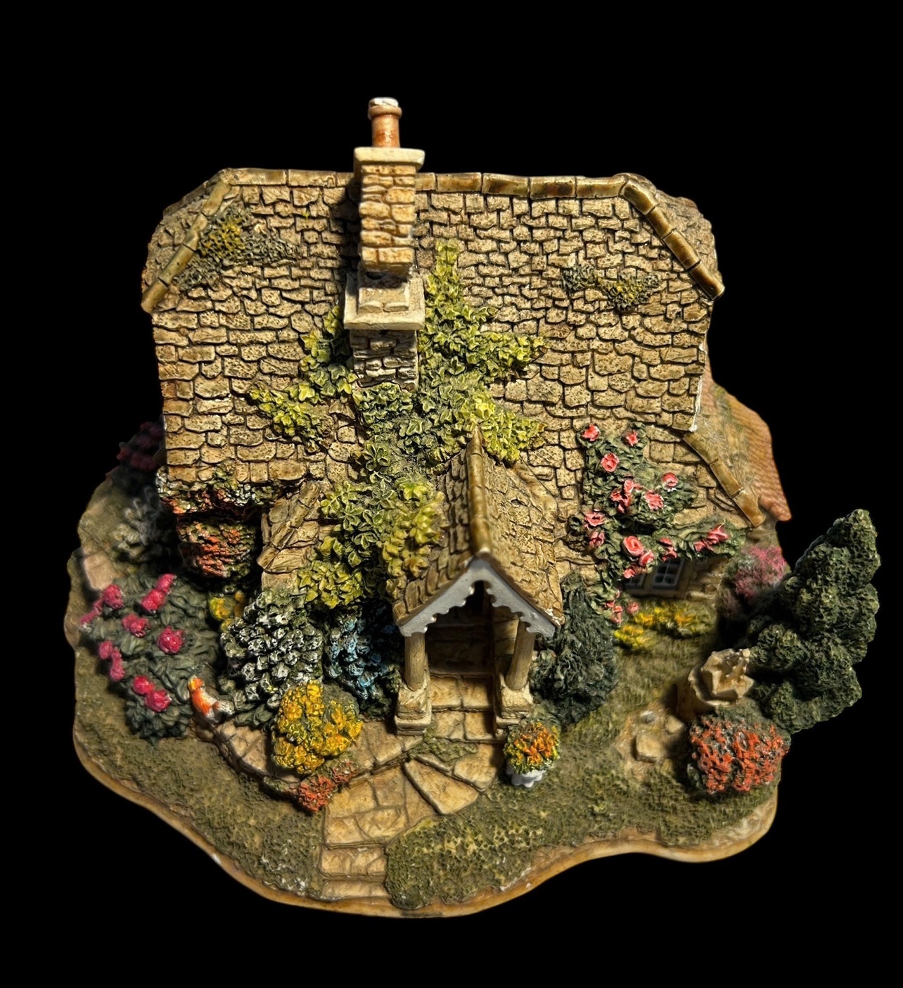 Tuyệt phẩm bạn đang sở hữu là một mô hình thu nhỏ mang phong cách đồng quê nước Anh – cụ thể là dòng tượng David Winter Cottages, được thiết kế bởi nghệ nhân David Winter và sản xuất bởi công ty John Hine Limited từ những năm 1979 đến cuối thập niên 1990. Những tác phẩm này nổi danh vì độ chi tiết kỳ công, mái ngói xưa cũ, đá sa thạch vàng, và những khu vườn nở rộ như cổ tích.