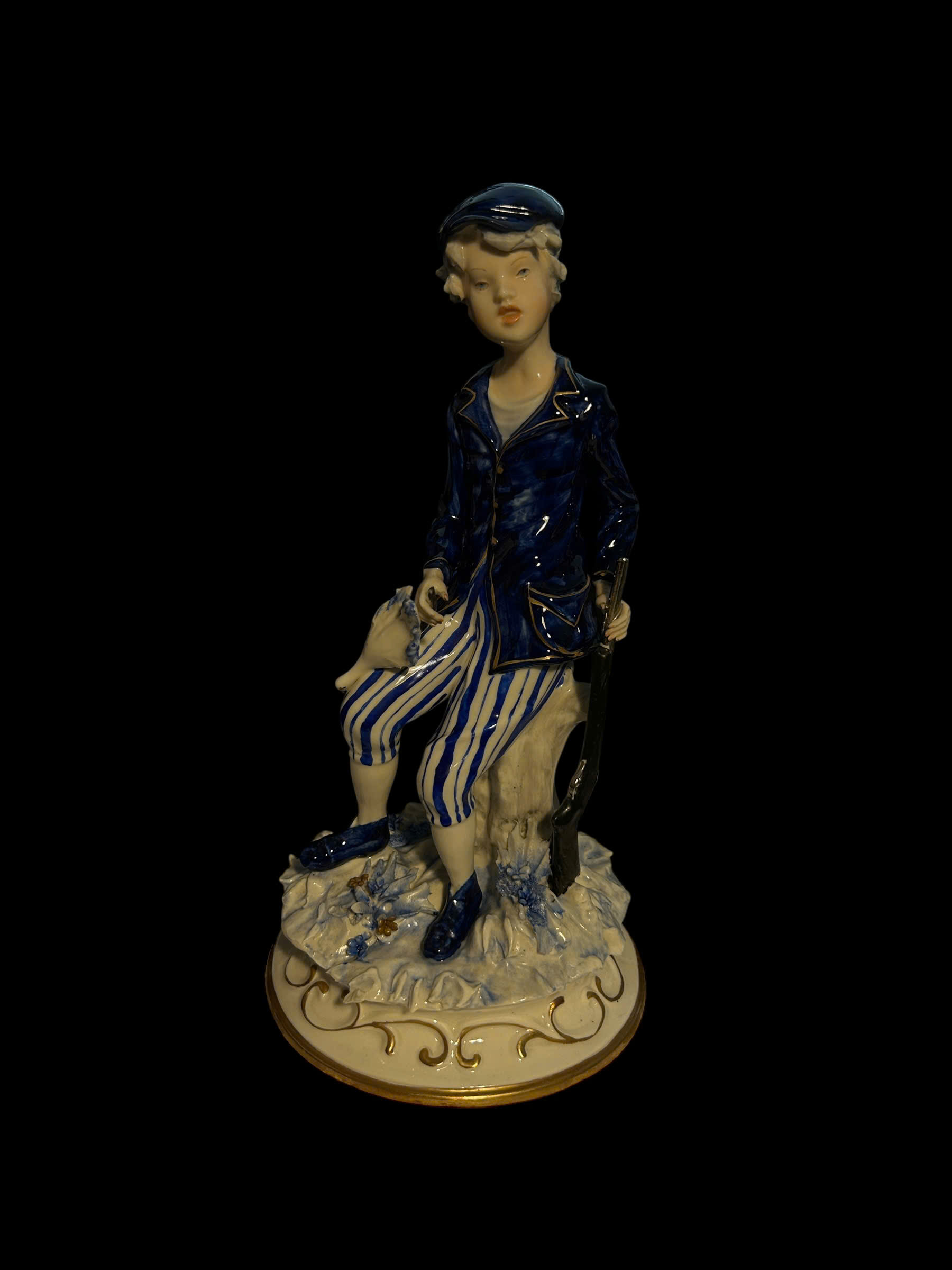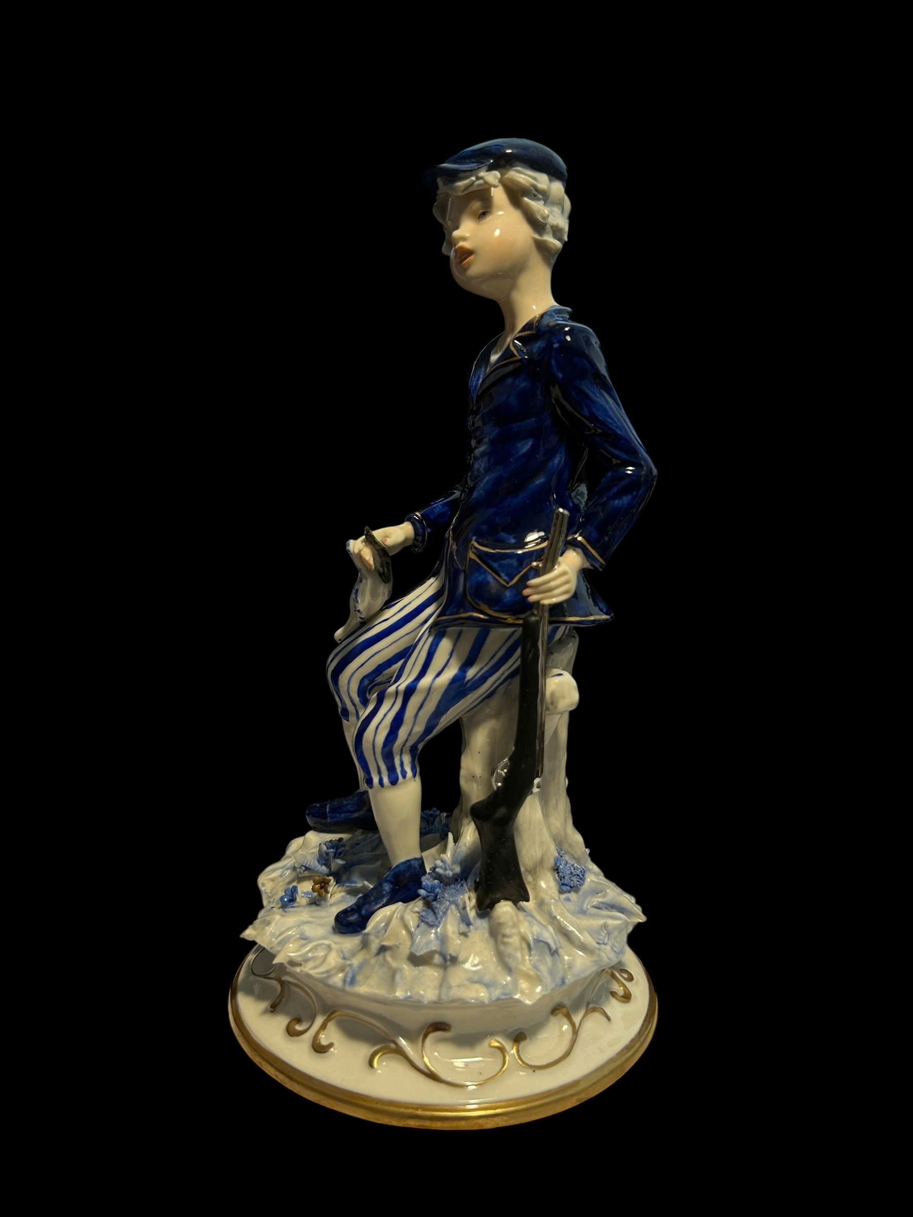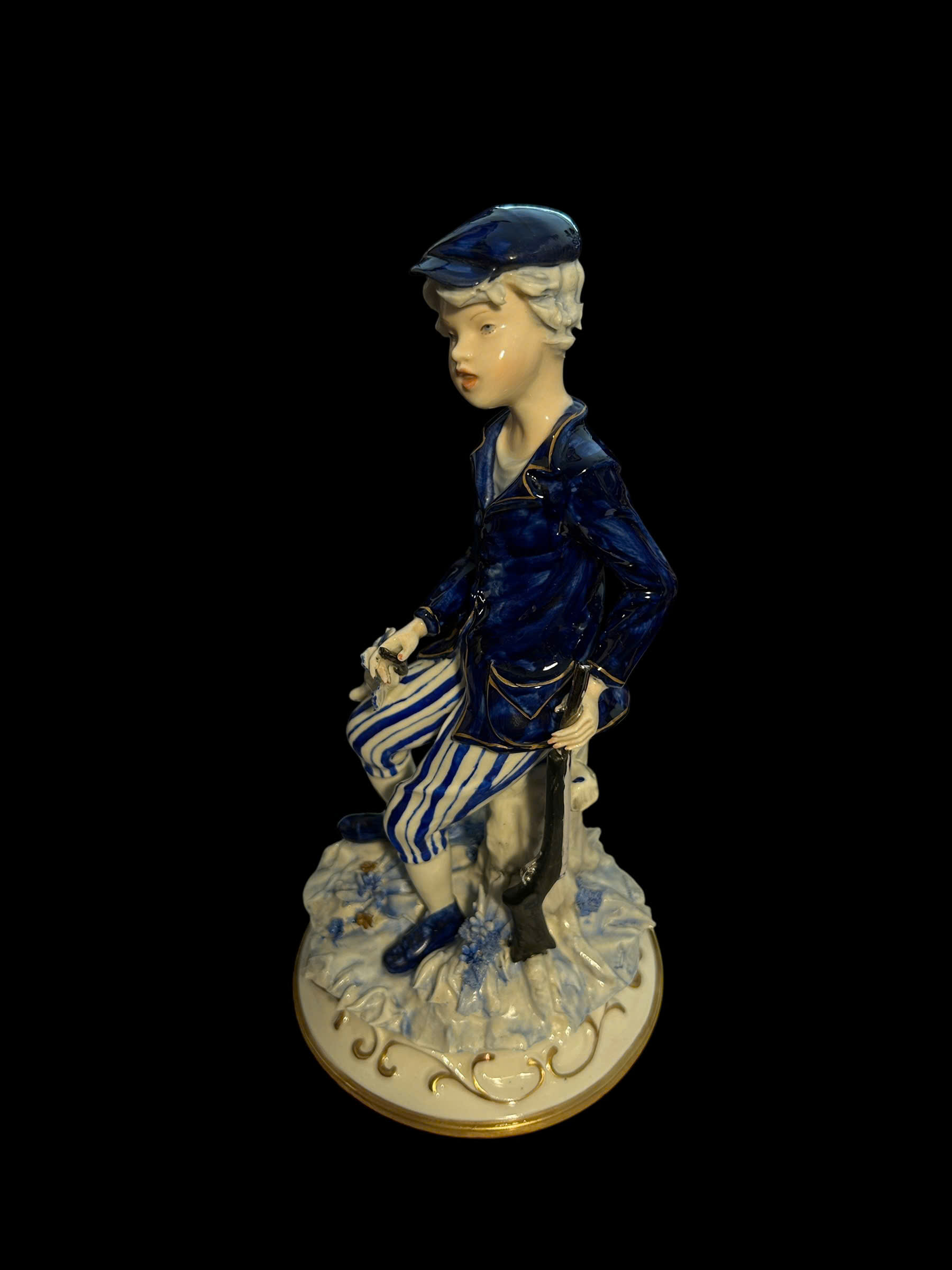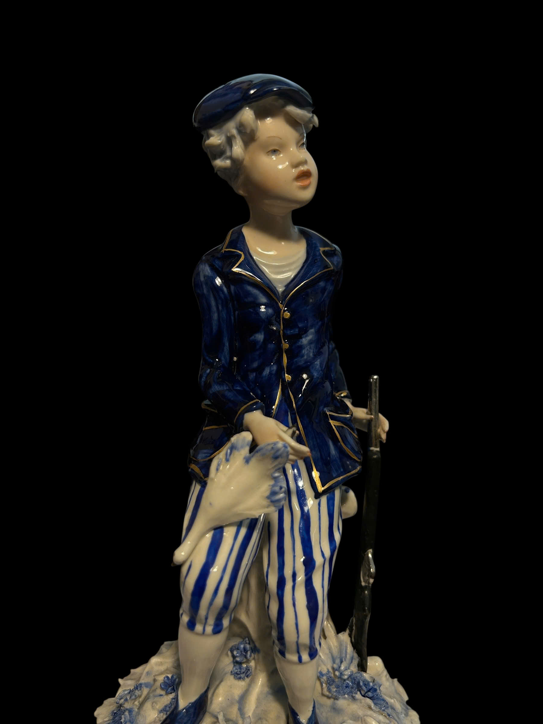 Cậu bé quý tộc trong bộ đồng phục thủy thủ hoàng gia, đứng kiêu hãnh với chiếc súng dài bên cạnh, chiến lợi phẩm bên chân.