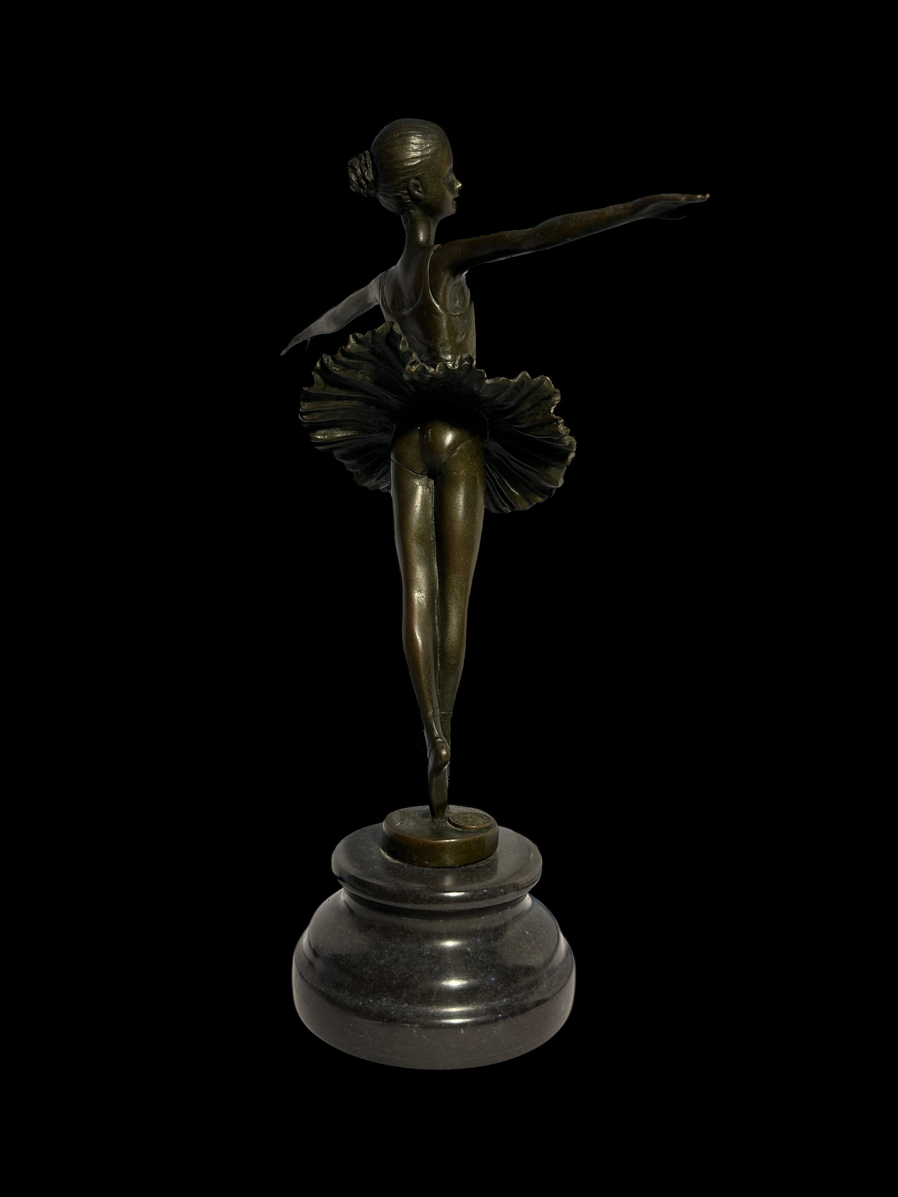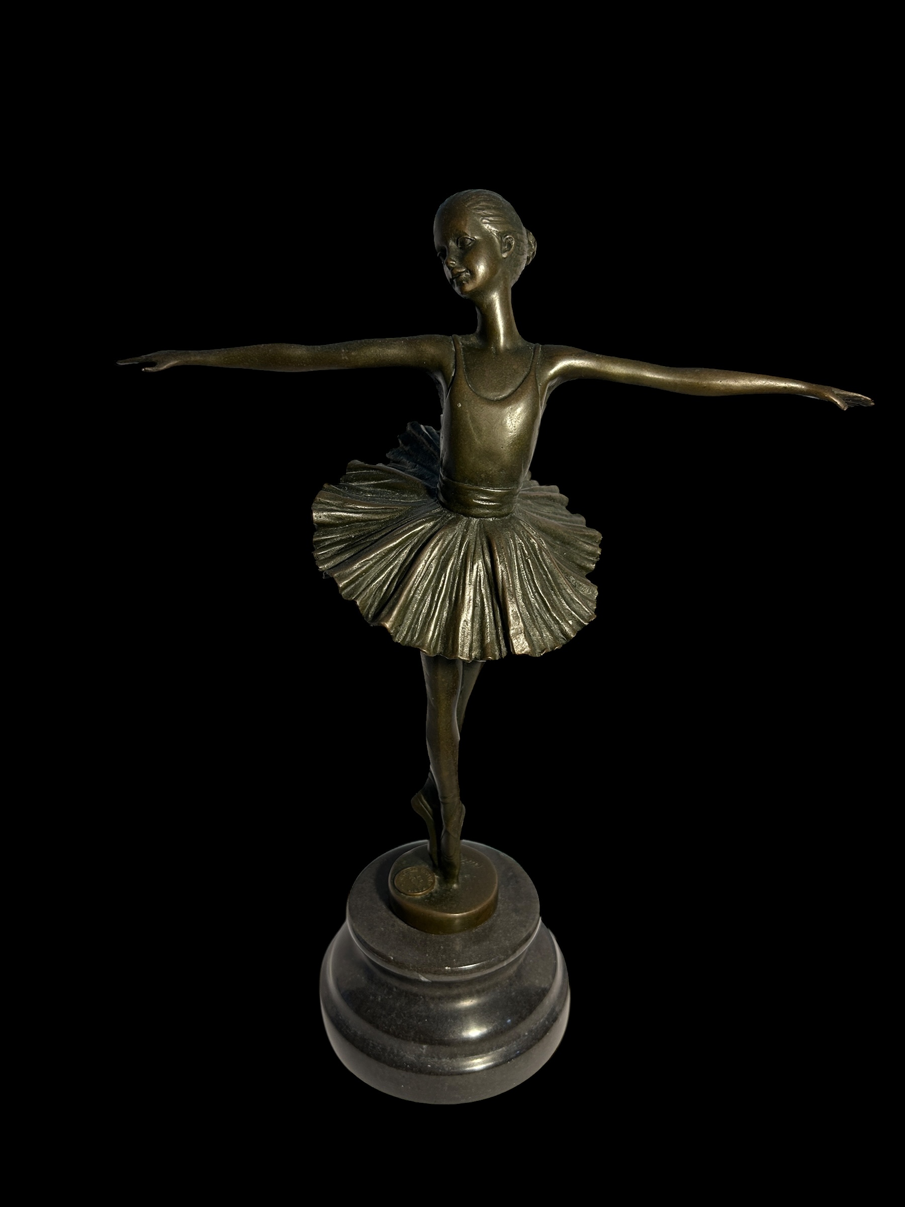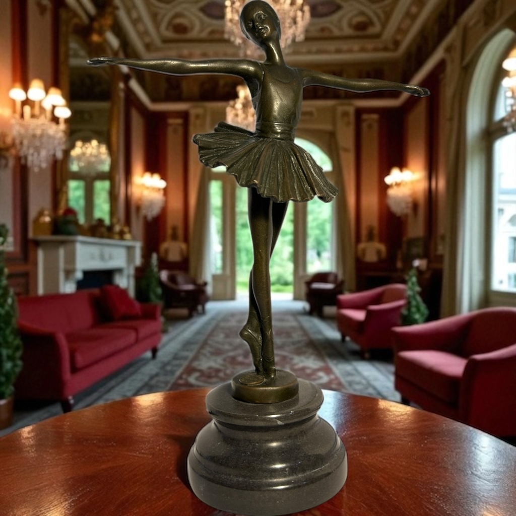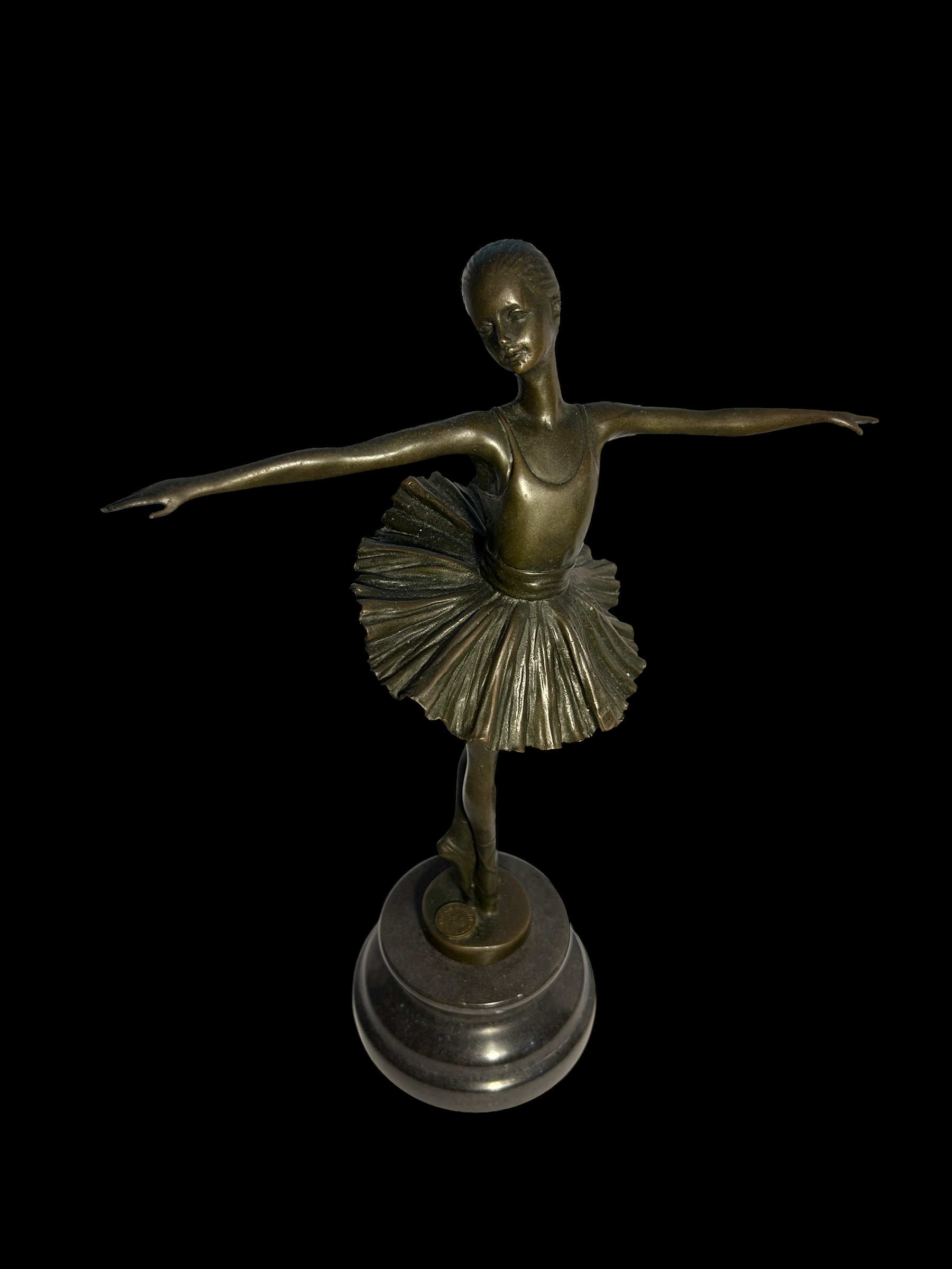 nàng đứng đó – dáng mảnh mai, kiêu sa, chiếc váy xòe bằng đồng tạo nên những nếp gấp sống động như đang lấp lánh giữa khúc nhạc thầm vang. chiếc bệ tròn chắc nịch bằng đá tự nhiên nâng nàng lên như một đóa hoa của sự thanh lịch và tập trung.