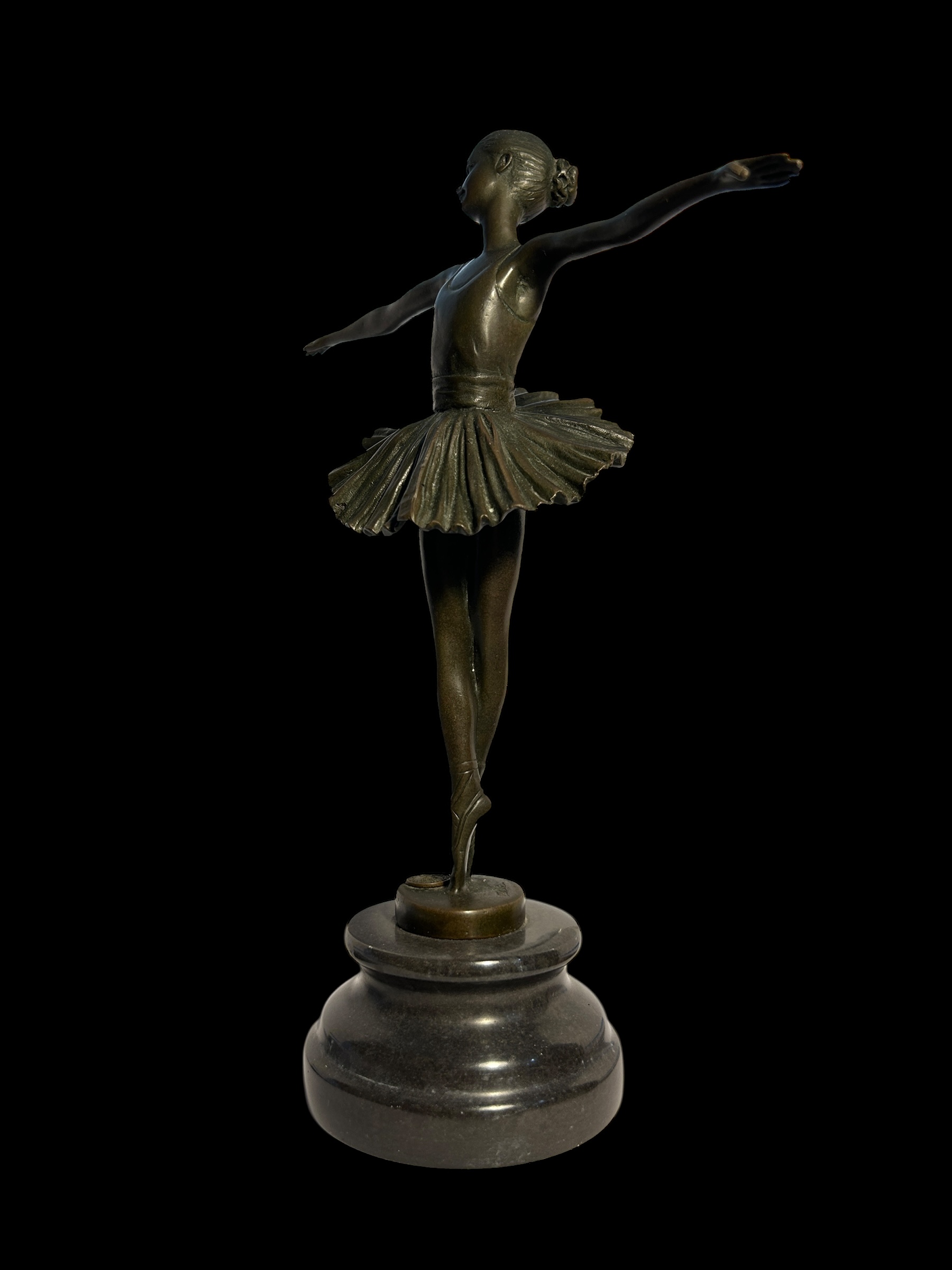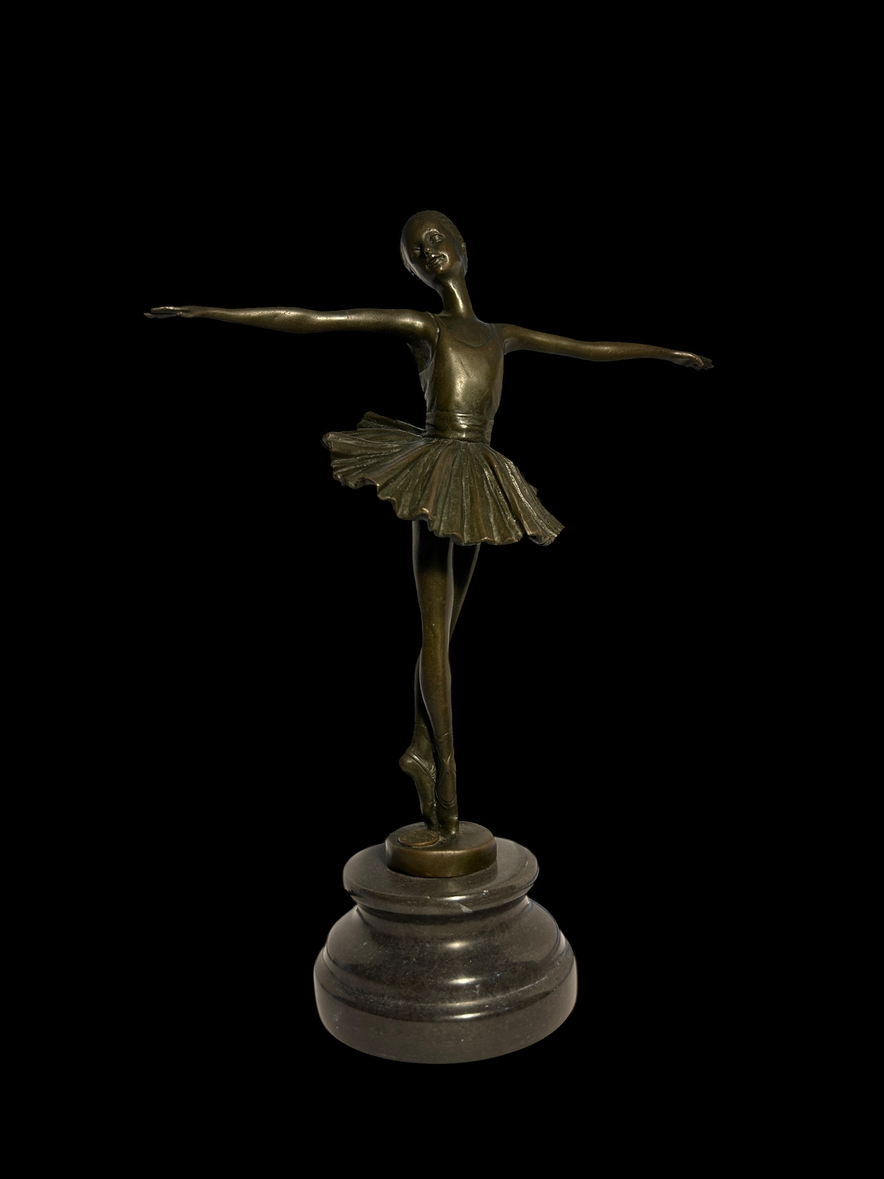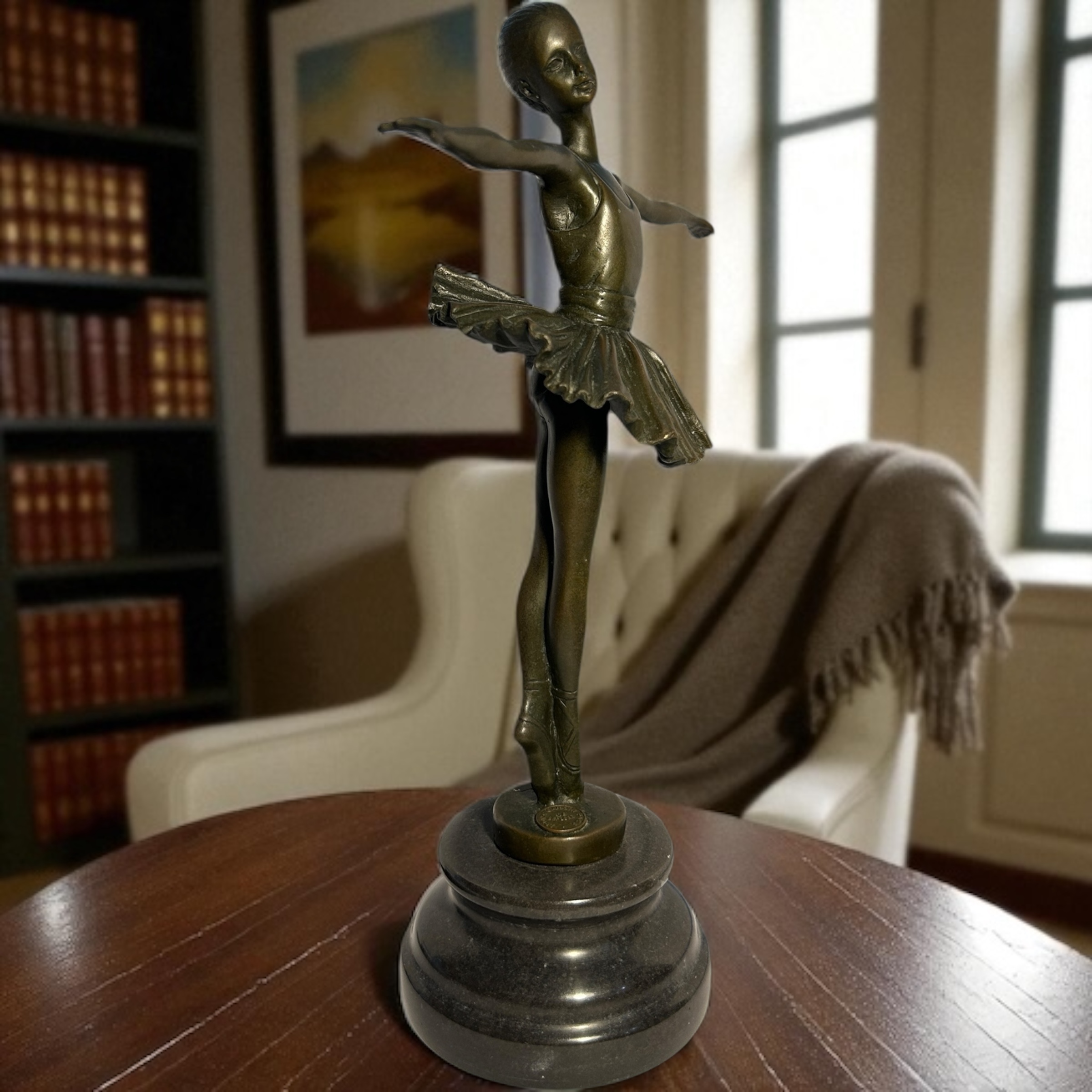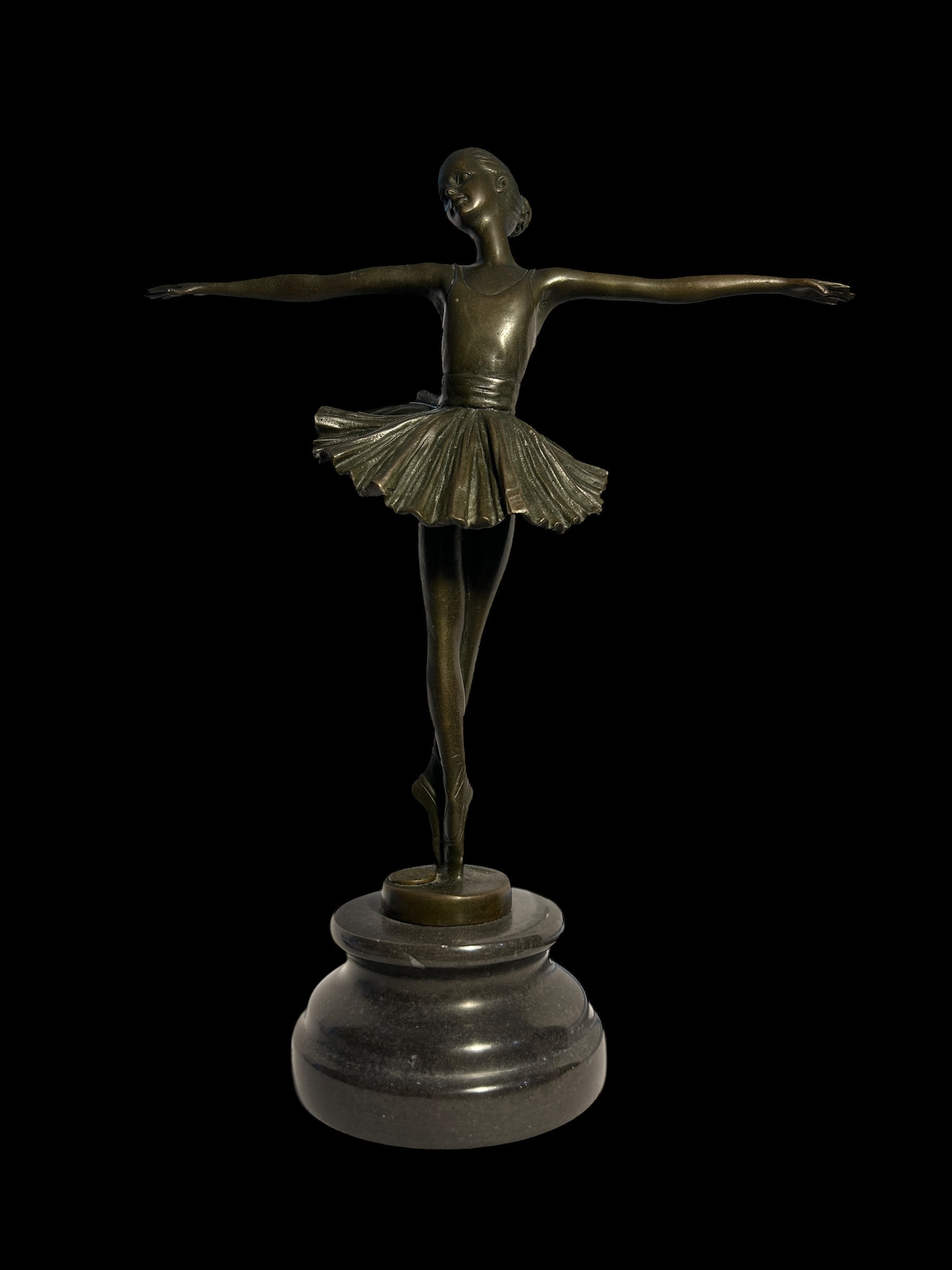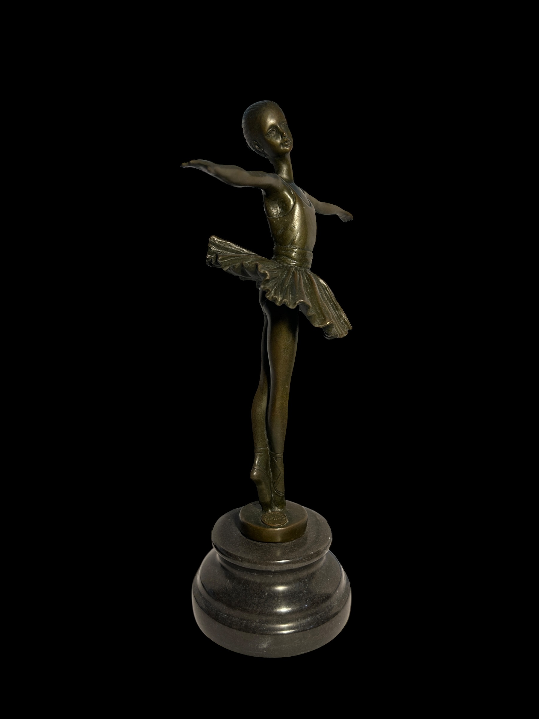 nàng đứng đó – dáng mảnh mai, kiêu sa, chiếc váy xòe bằng đồng tạo nên những nếp gấp sống động như đang lấp lánh giữa khúc nhạc thầm vang. chiếc bệ tròn chắc nịch bằng đá tự nhiên nâng nàng lên như một đóa hoa của sự thanh lịch và tập trung.