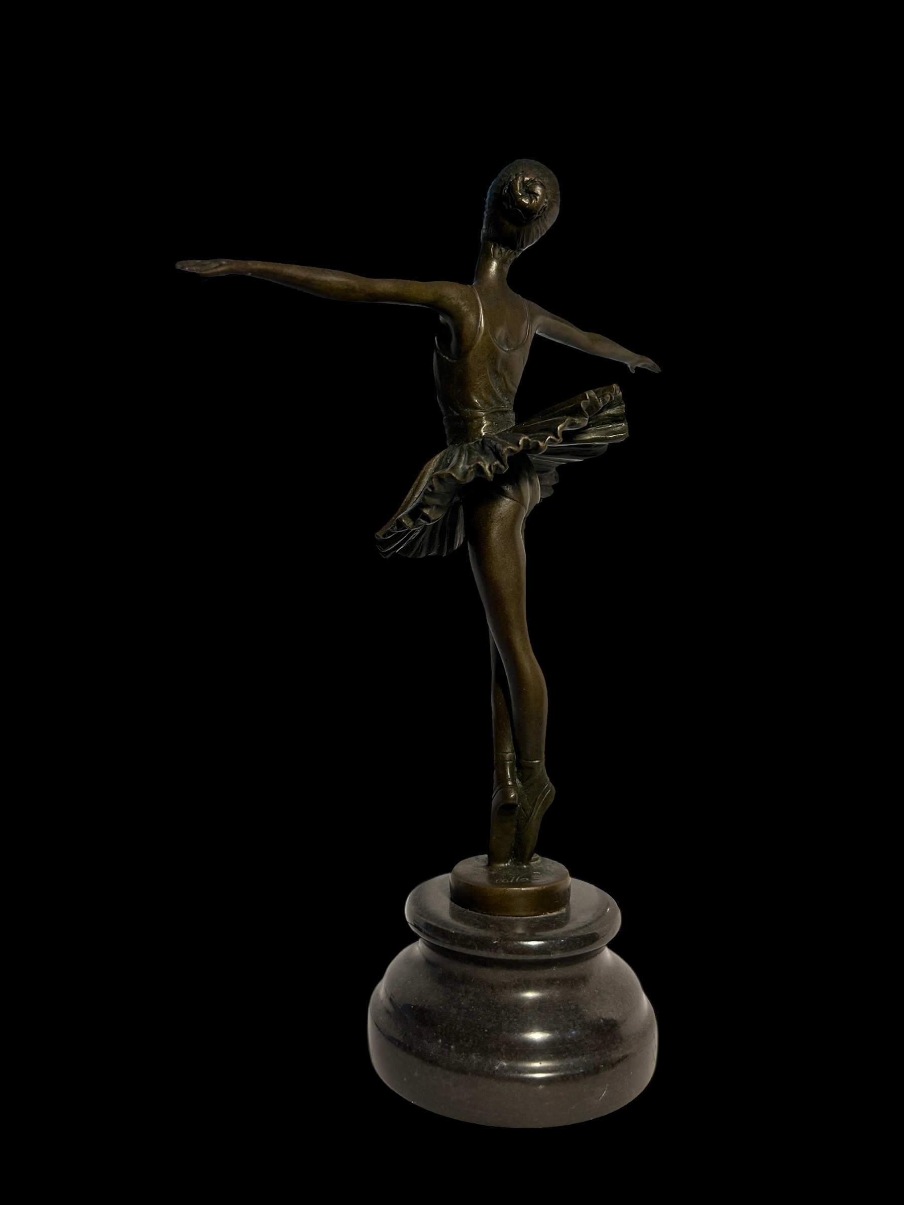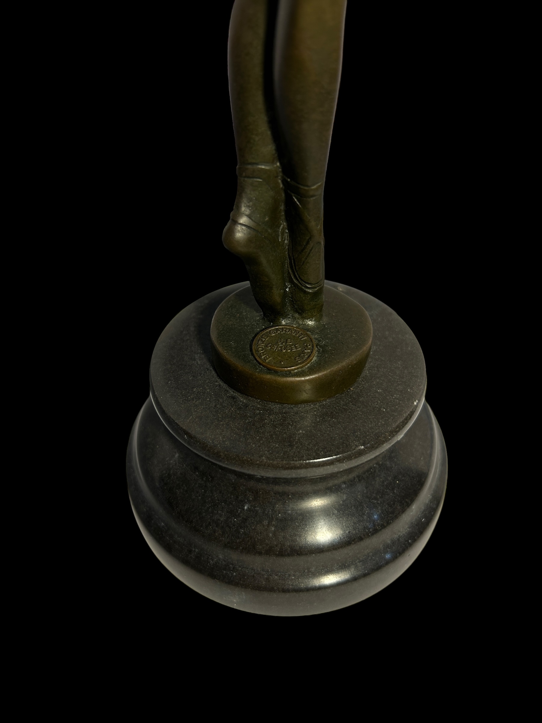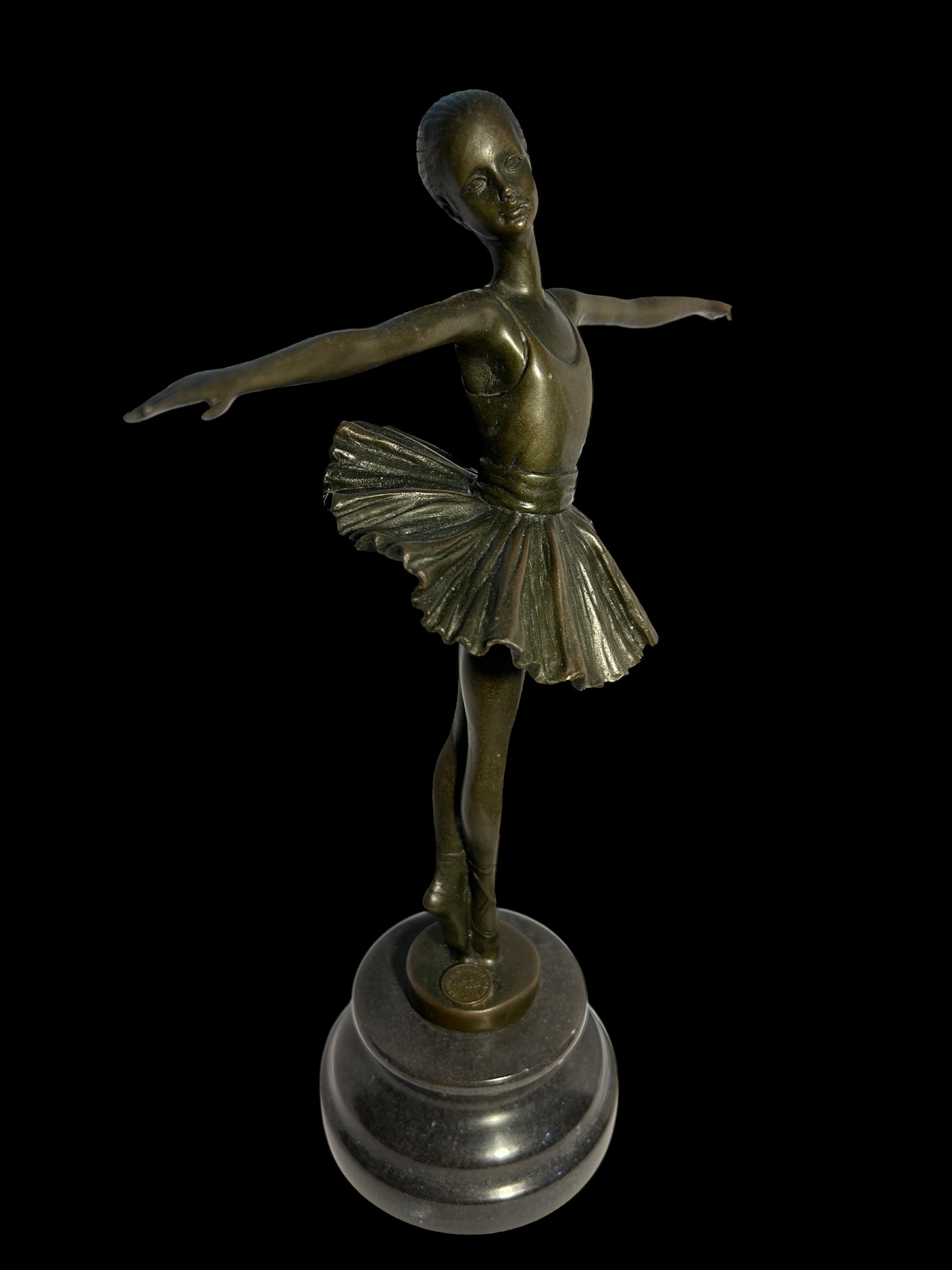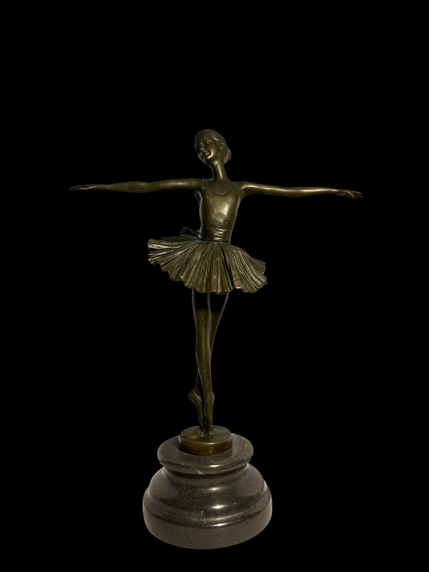 nàng đứng đó – dáng mảnh mai, kiêu sa, chiếc váy xòe bằng đồng tạo nên những nếp gấp sống động như đang lấp lánh giữa khúc nhạc thầm vang. chiếc bệ tròn chắc nịch bằng đá tự nhiên nâng nàng lên như một đóa hoa của sự thanh lịch và tập trung.